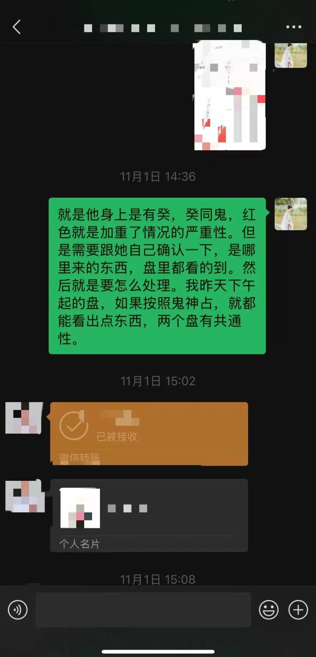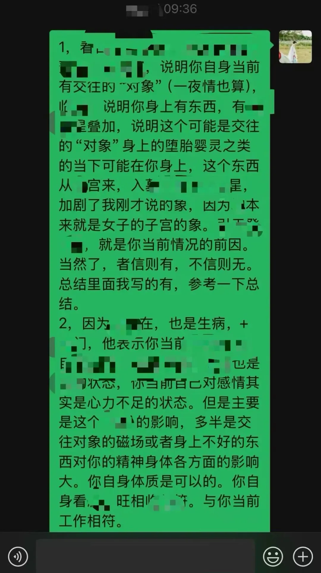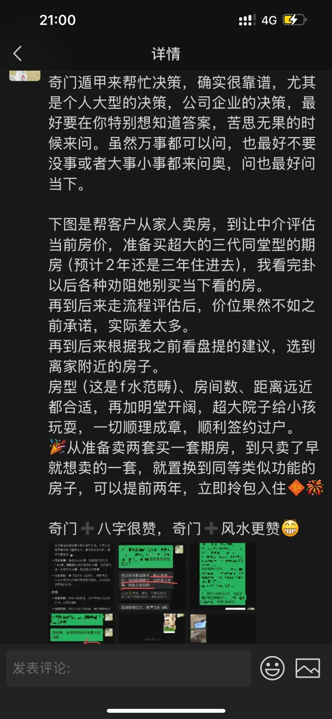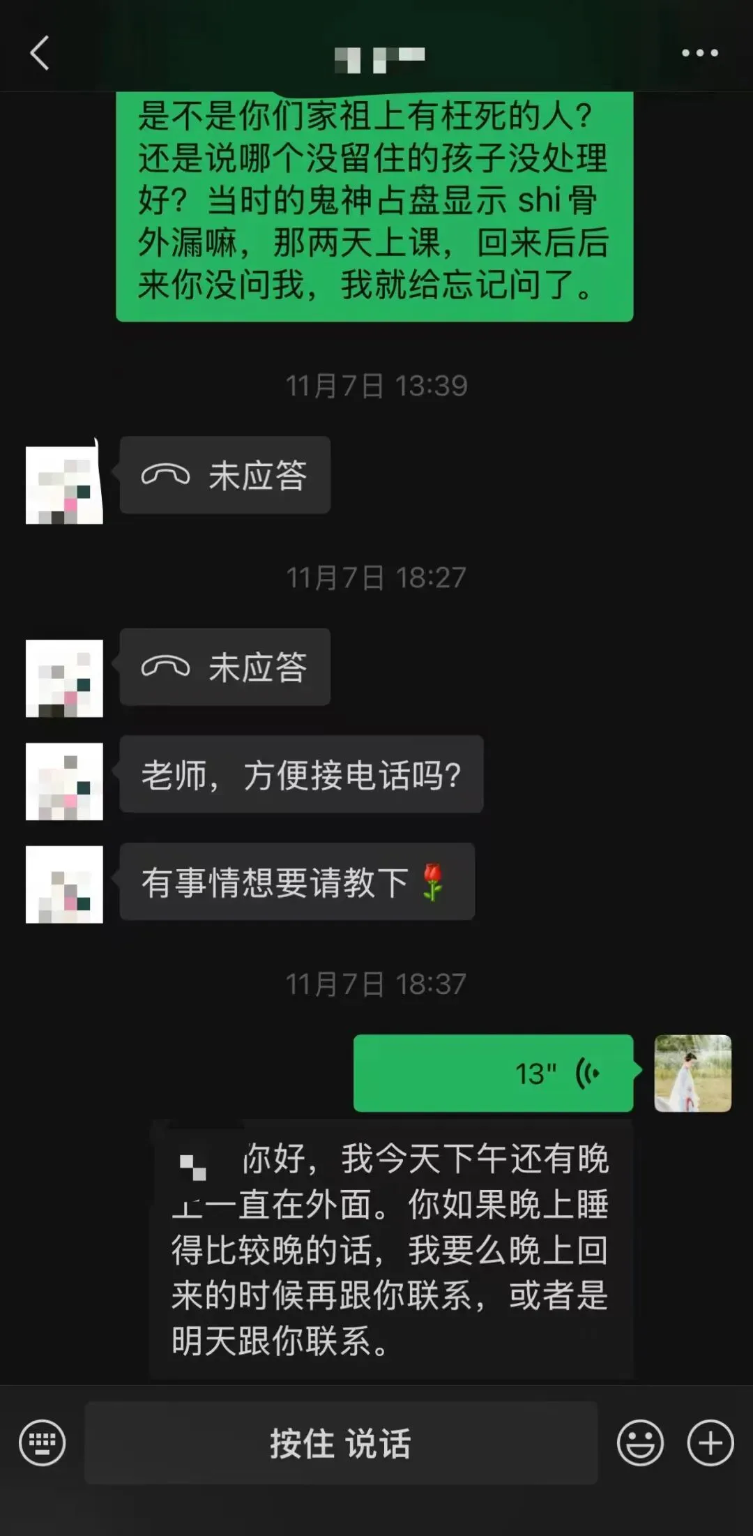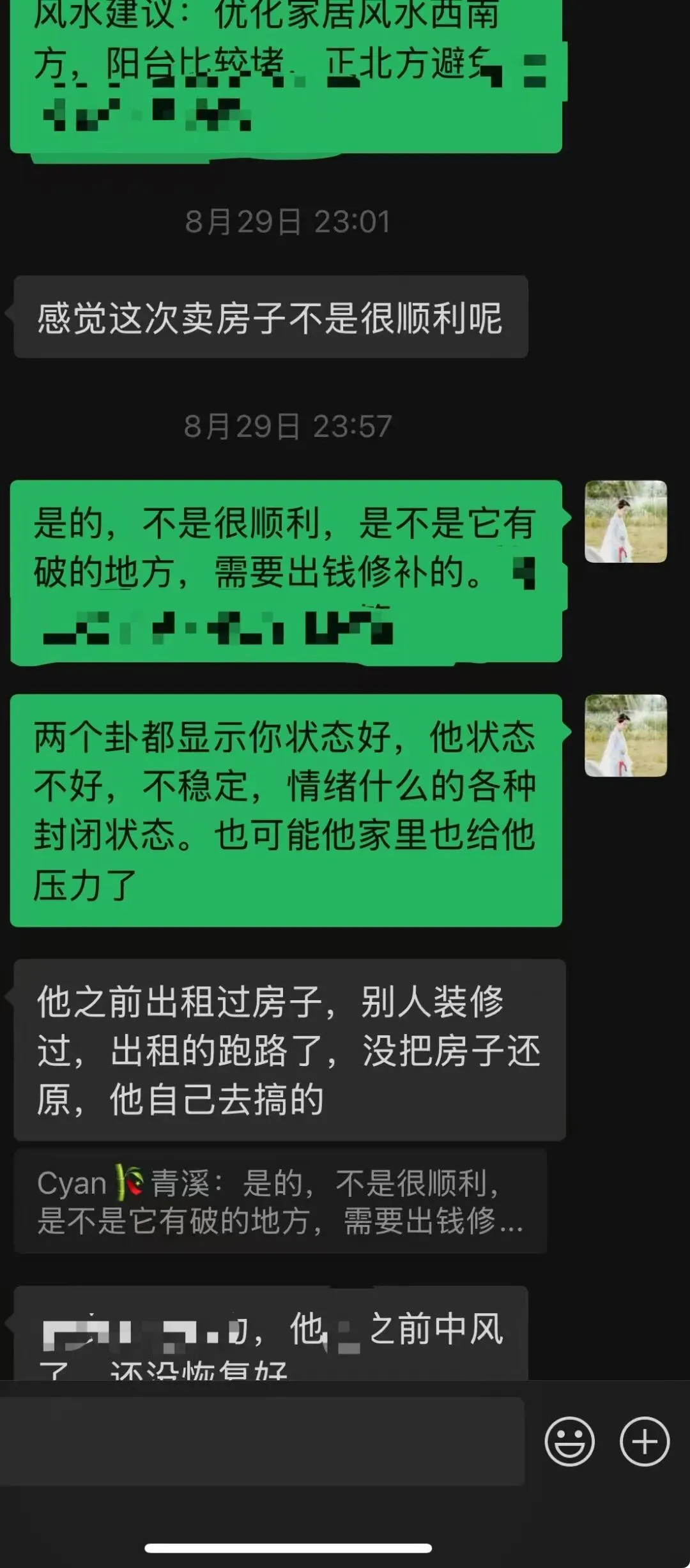 案例一:根据八字看这个出问题的小孩确实比较躁郁,脾气大,有突然发生的倾向。好好的人突然之间好像变了一个人一样。本年最开心的是农历七八月(申酉月),最近一个月(进入农历戌月)尤其严重。当下脾气差。答都是对的。关于孩子妈妈好奇的👻,我也好奇,我给他们家看完风水后来还特意要了当时看盘的更细节的反馈,问盘中看到家里祖先有枉si之人是不是?答案是,出问题的男孩,他父亲的爷爷还是外公(写当下文字距离聊天时间太久记不住了),在家上diao离去。风水关联八字当下的运势,八字也就是出厂设置。出厂设置源于他家的祖坟和业力,同步到今年命运,又叠加居住环境的问题,于是灾难困顿立现。给了调整的方法,但是部分关键的位置,家人(家里老人)不愿意做任何改动。这不愿意改动的部分其实也是源于隐性能量的干扰,没清理干净,所以是yuanqin zhaizhu的原因,它还不想让你好起来。