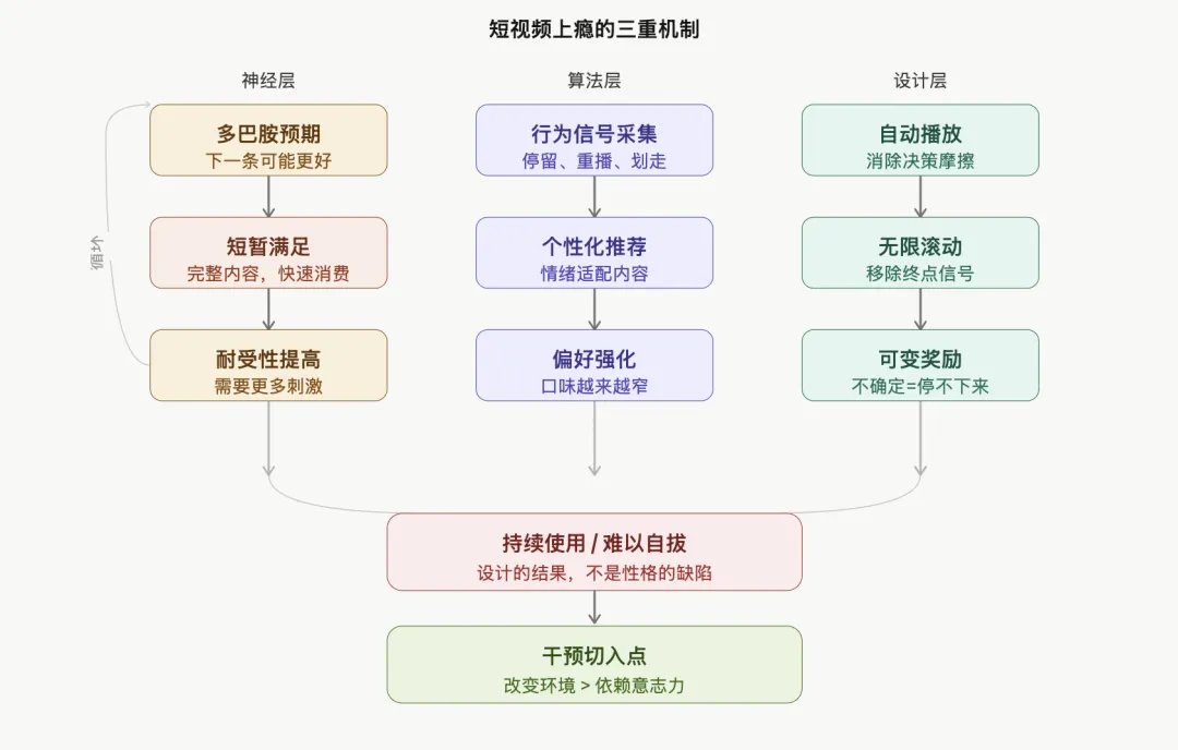 ▶短视频上瘾和抑郁之间存在相互强化的关系,一方面,短视频快、强、连续的高刺激,把你的“快乐阈值”抬得超高,让你对现实生活逐渐失去兴趣,另一方面,当你情绪低落时,又更容易通过低门槛的短视频来逃避现实。形成用得越多,情绪越差,反过来又更依赖它的负循环。