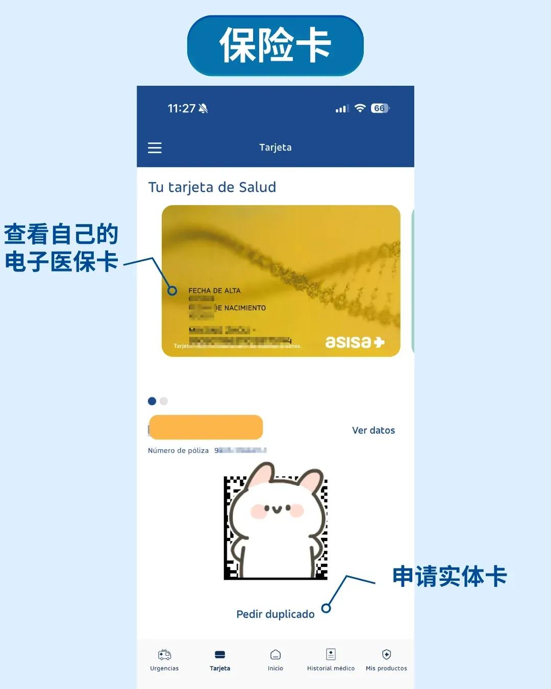 在进入首页后的最下方,点击tarjetas 就可以直接查看到自己的电子医保卡啦。很多医疗中心现在都支持直接扫码或出示电子卡就诊, 如果不小心丢失实体卡也可也通过app重新申请一张(solicitar duplicado)