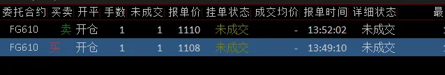 2026-04-16 13:54:22.610278 -open_close卖一价1110.0存在未成交的挂单,未成交数量1,有自成交可能,合约:FG610,交易方向:kaiduo,下单价格:1221.0,买入价:1221.0,卖出价:1221.0,下单手数:12026-04-16 13:54:22.610858 -open_close买一价1108.0存在未成交的挂单,未成交数量1,有自成交可能,合约:FG610,交易方向:kaikong,下单价格:1019.0,买入价:1019.0,卖出价:1019.0,下单手数:1