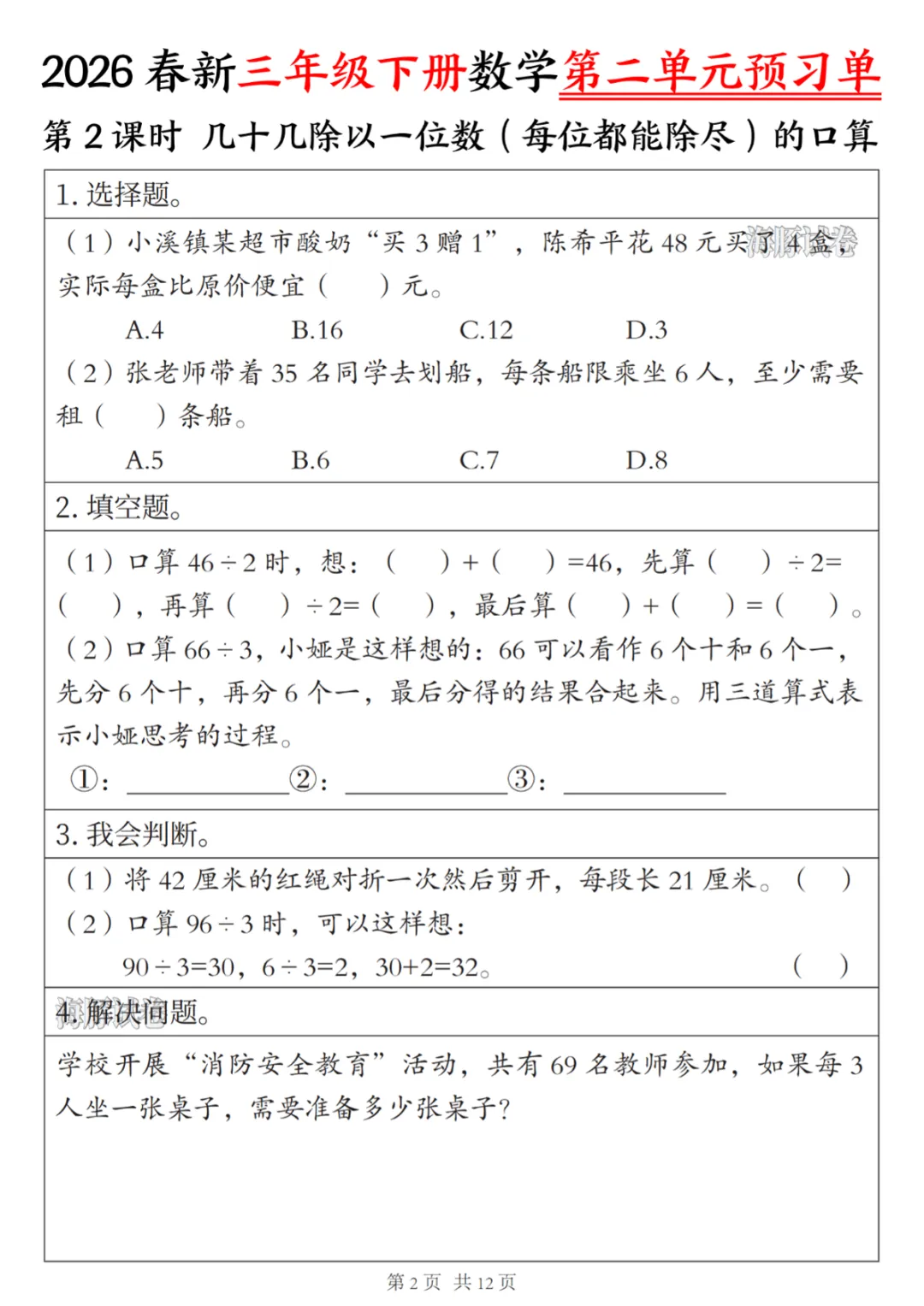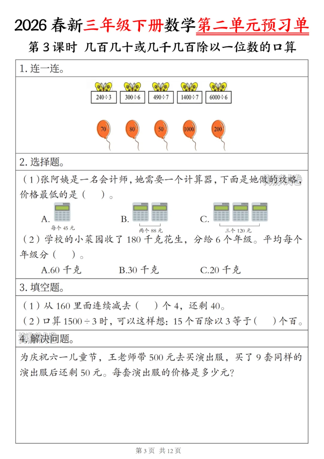 三年级(下)数学第二单元预习单 电子版可打印