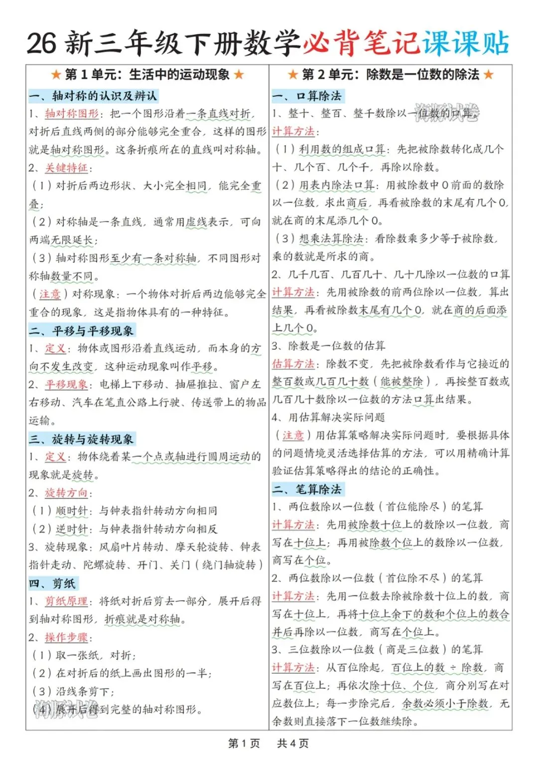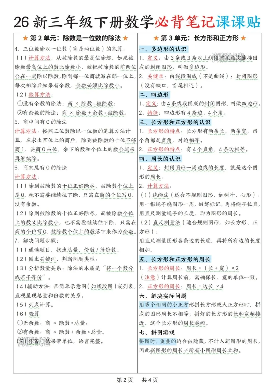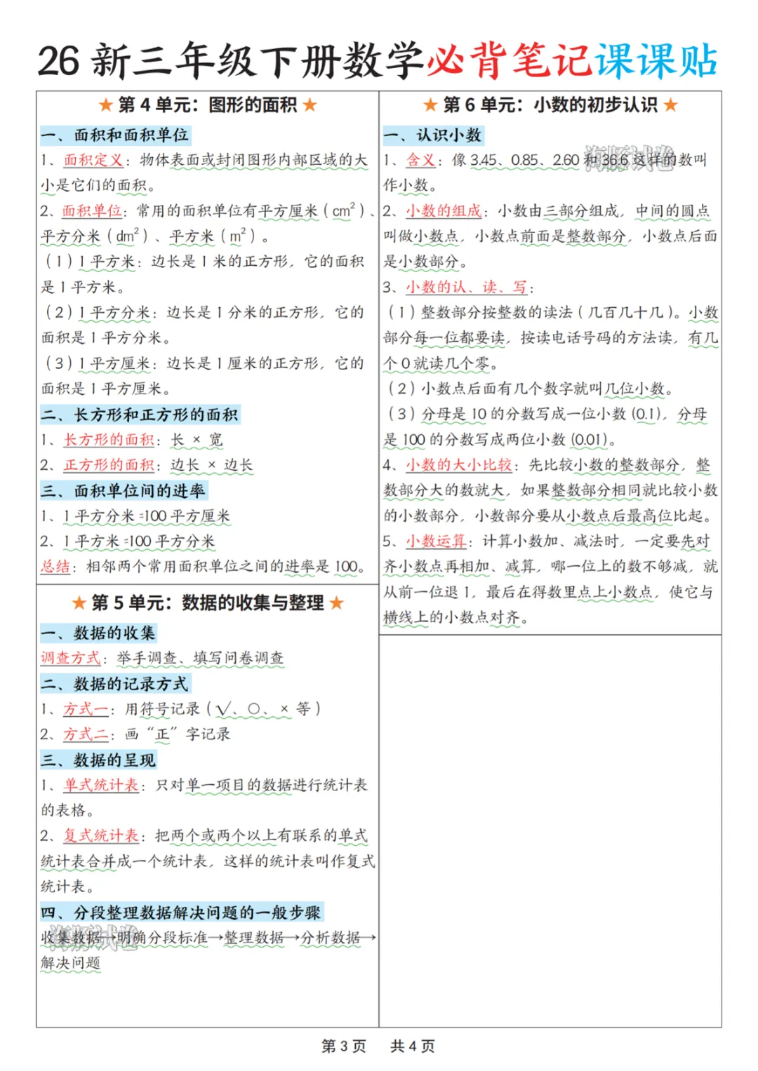 三年级(下)数学必背笔记课课贴 电子版可打印