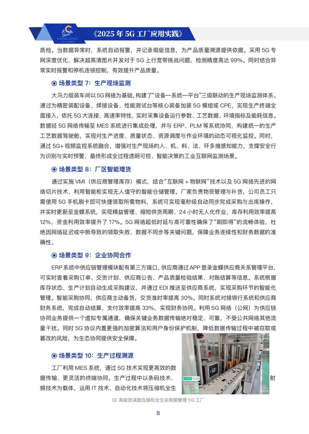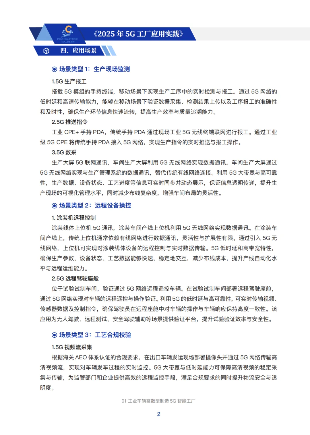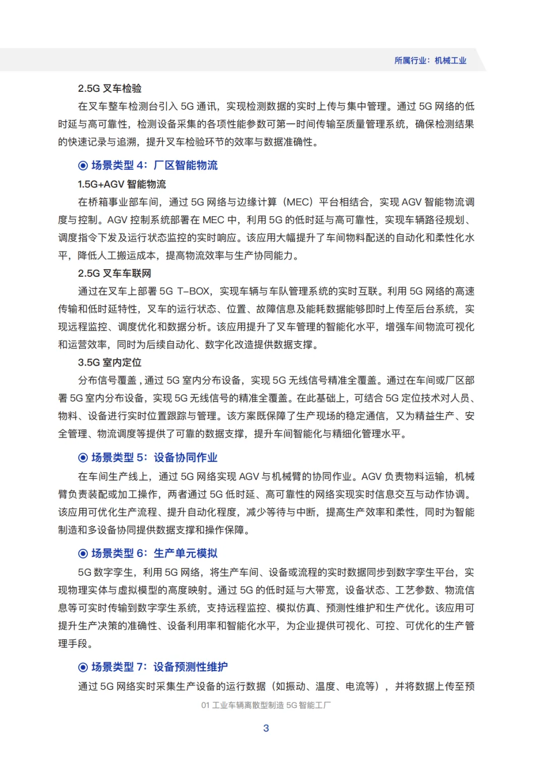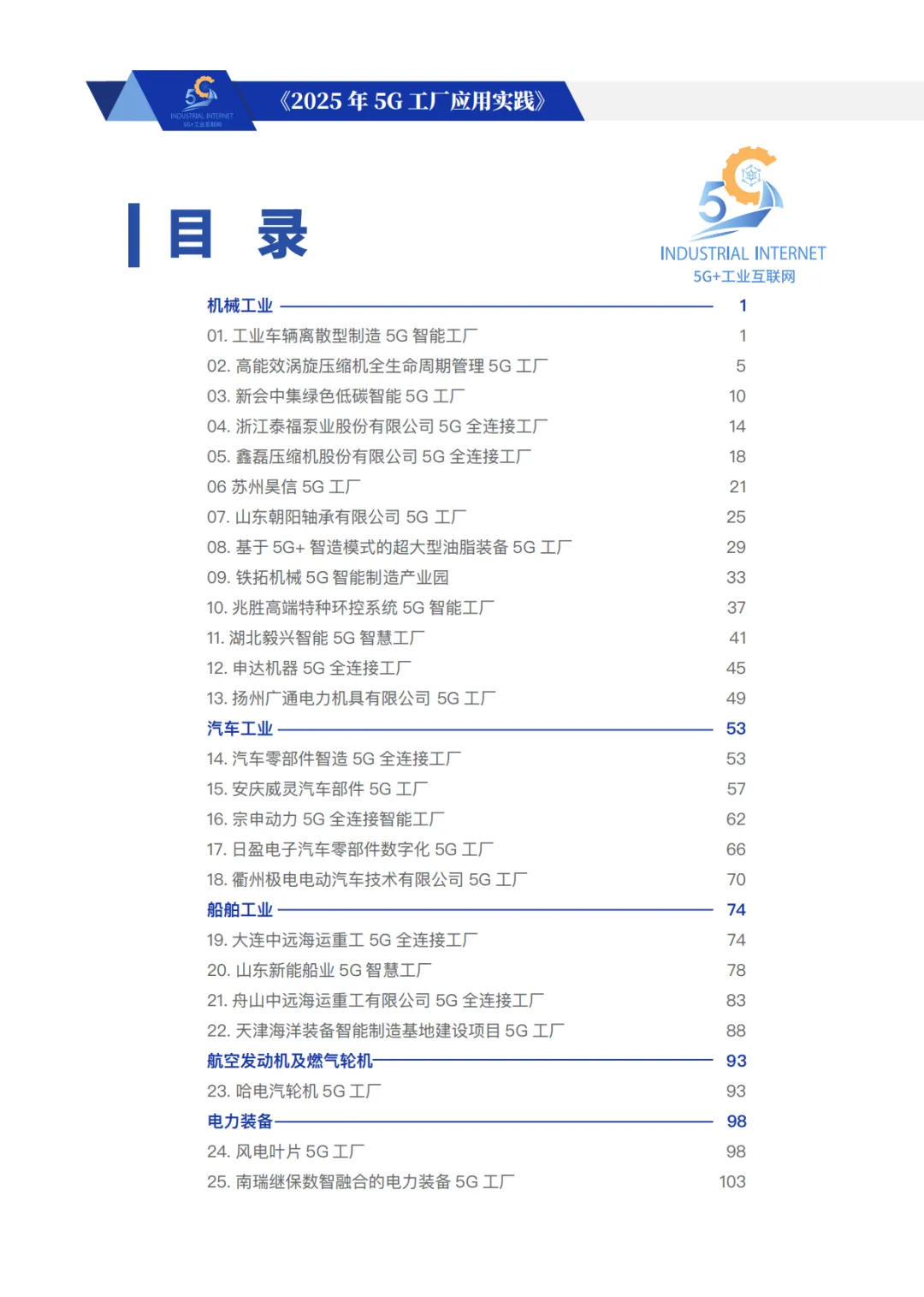 2025年装备工业5G工厂应用实践报告,聚焦机械、汽车、船舶、航空发动机及燃气轮机、电力装备五大行业,梳理25个标杆项目的实践经验。这些项目统一采用5G-SA专网搭配MEC边缘计算的端-边-云架构,深度落地机器视觉质检、AGV智能物流、设备预测维护等核心场景,普遍实现生产效率、成本控制与能耗管理的显著优化,为装备制造行业的数智化转型提供了规模化可复制的实践路径。
