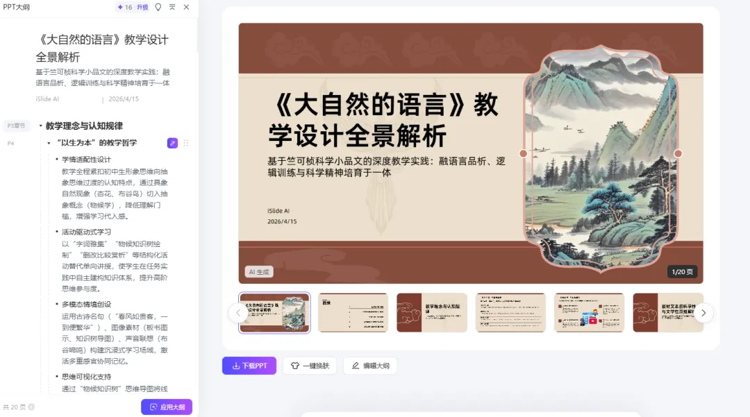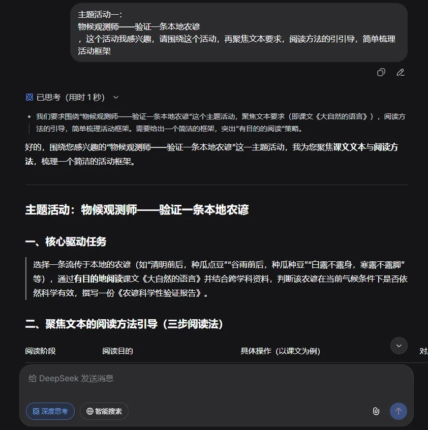 生成合适结果后,选定一个主题,再进行分步生成:“跨学科核心任务“、“具体的“教学流程(含各环节意图)”及可操作的“学习效果评价方案”等。
