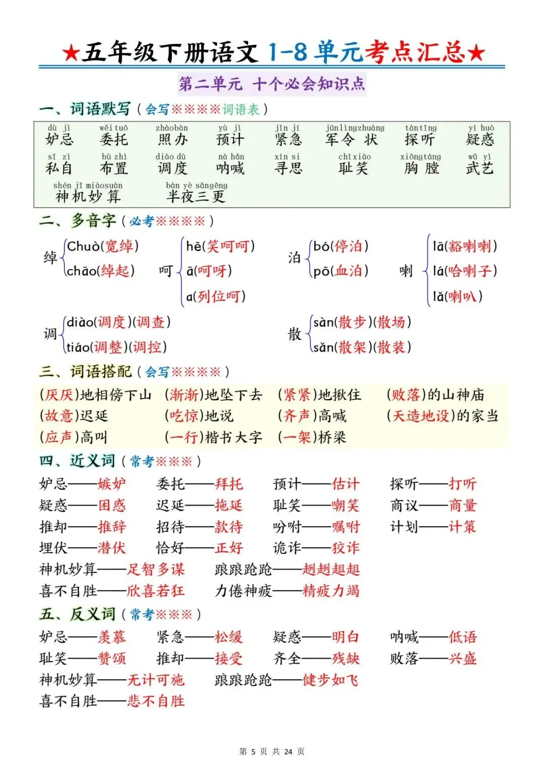 【1-8单元考点汇总】五下语文(高清可下载) 小学精选同步试卷来啦!通过练习既能检验孩子知识点的扎实度,揪出薄弱环节,也能助力新课预习、旧知巩固,让学习节奏不脱节,快陪孩子练起来吧!建议各位家长领取打印给孩子学习! (温馨提示:文末有完整电子版领取方式) 课本同步学习工具 推荐图书 免费领取完整电子版: ①:点一点右下角的“赞”和“在看”,感谢!②:在公众号对话框中回复:1103 说明 本微信公众账号分享的资源均通过网络等公共合法渠道获取,仅供试用!版权归原出版机构、影像公司或作者所有,资源仅限家庭学习交流与辅助购买决策使用,严禁商业用途。文章中的视频及图片亦来自网络,若有侵权,请及时联系删除。