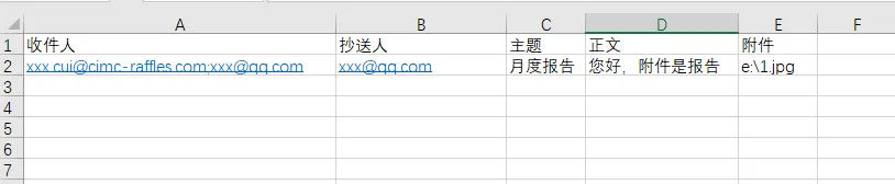 数据对应:A列=收件人、B列=抄送、C列=主题、D列=正文、E列=附件,与表格一一对应;