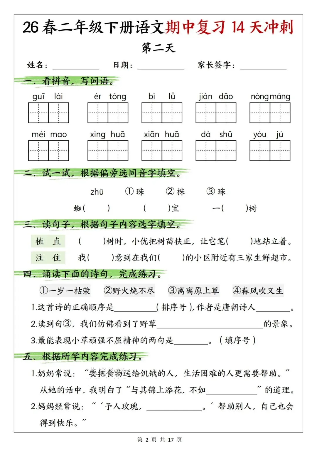 二年级下册语文《期中复习14天冲刺》可下载打印
