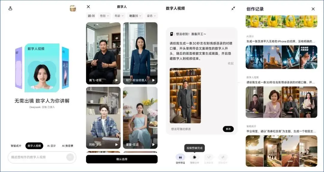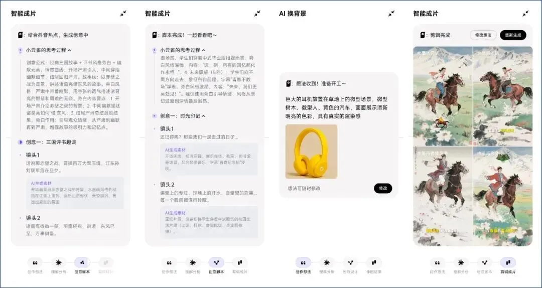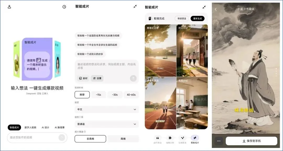 它的AI智能成片过程包括:创作想法、理解分析、创意脚本、剪辑成片,每一步都非常详细,支持修改,支持一键生成多个不同风格的视频,支持将生成的视频免费保存到手机。