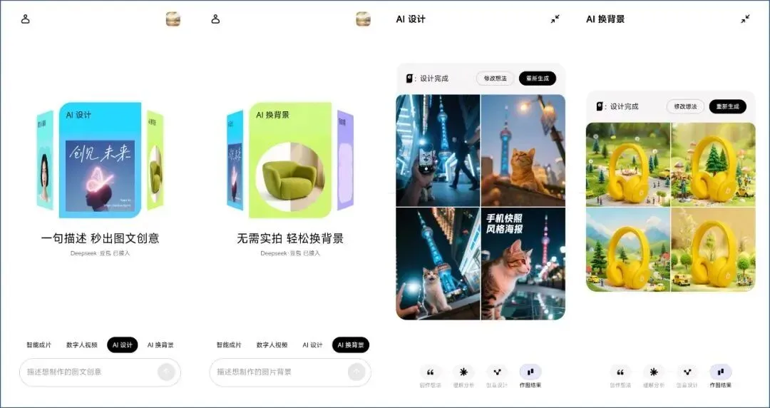 最后,它还支持AI设计和AI换背景功能,其中AI设计功能只需要一句话就可以批量生成高级感风格化图片,AI换背景功能可以根据需求匹配多元化图片背景,支持精准抠图和无需专业棚拍。