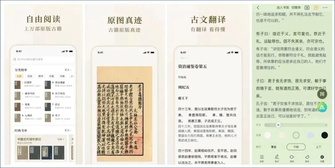 它支持强大的古籍学习功能,包括:古文翻译、同时展示译文和原文、随心划线做笔记、笔记标记、阅读时写想法、汉语字典、汉语词典、字词精准释义、说文解字。