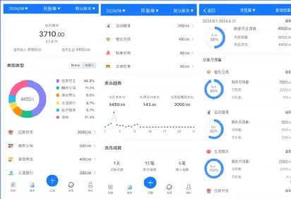 其中预算设置支持设置每个月的总预算和每个类别月预算,支持展示剩余百分比和剩余月预算。