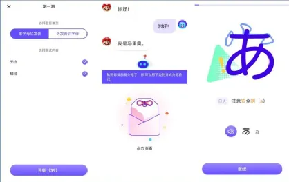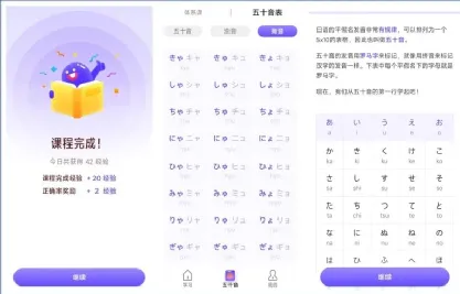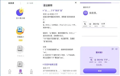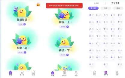 首先,它支持日语学习,支持日语五十音学习,包括体系课和五十音表,体系课包括:五十音介绍、平假名学习、片假名学习,五十音表包括:五十音、浊音、拗音。