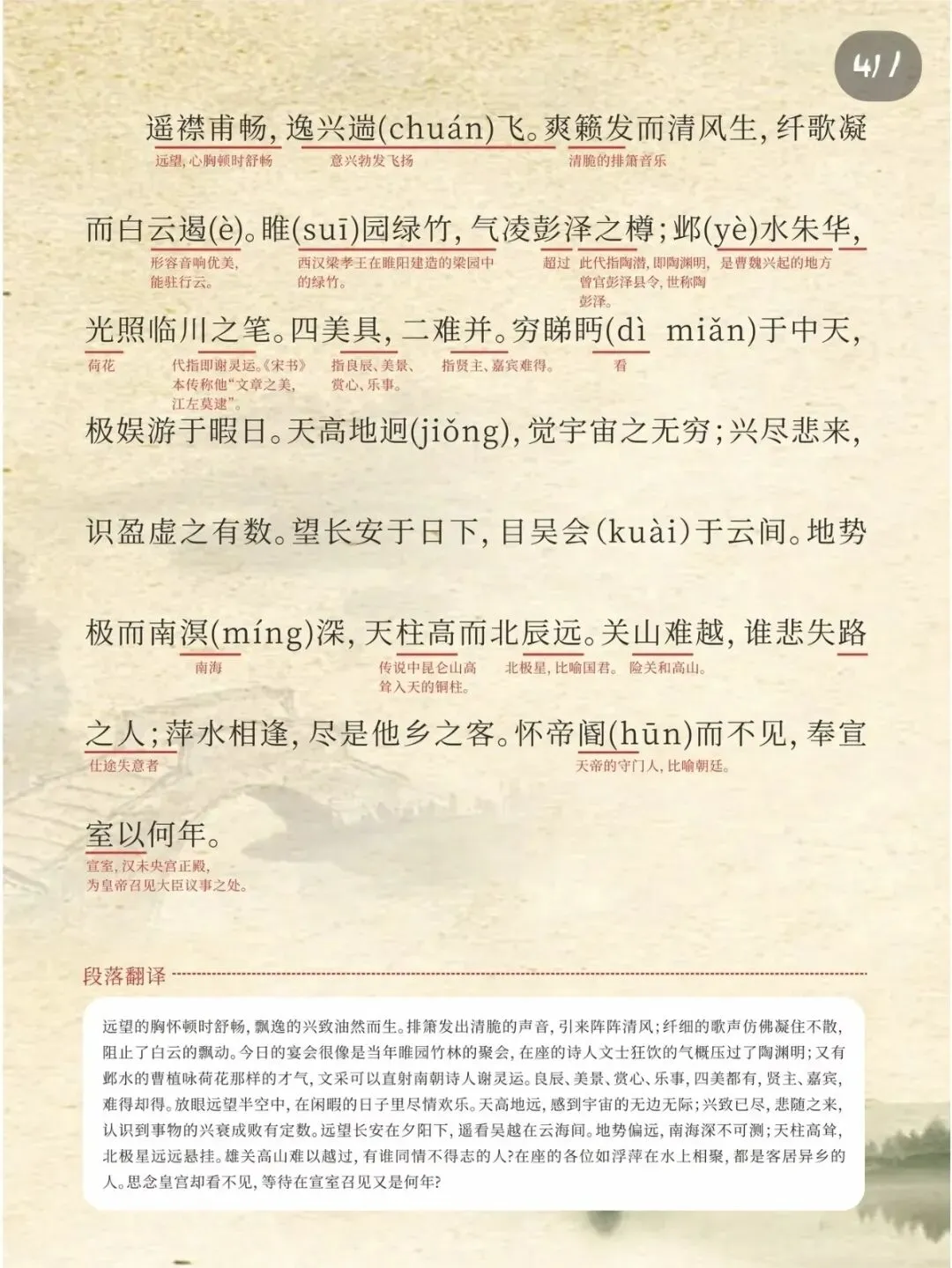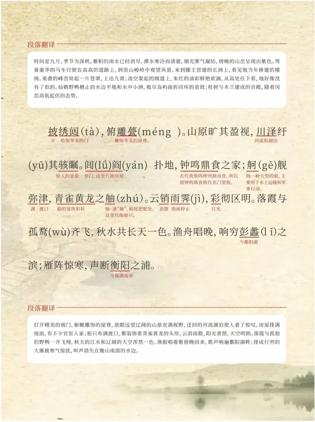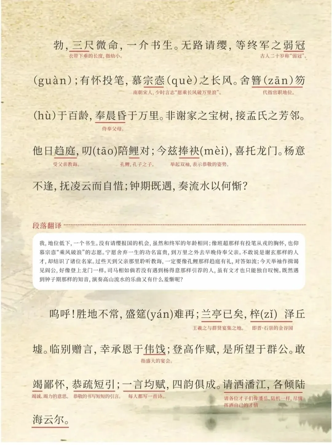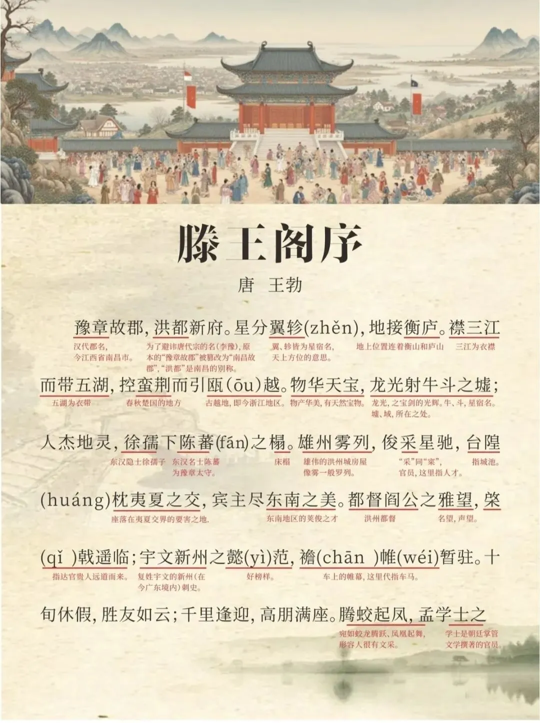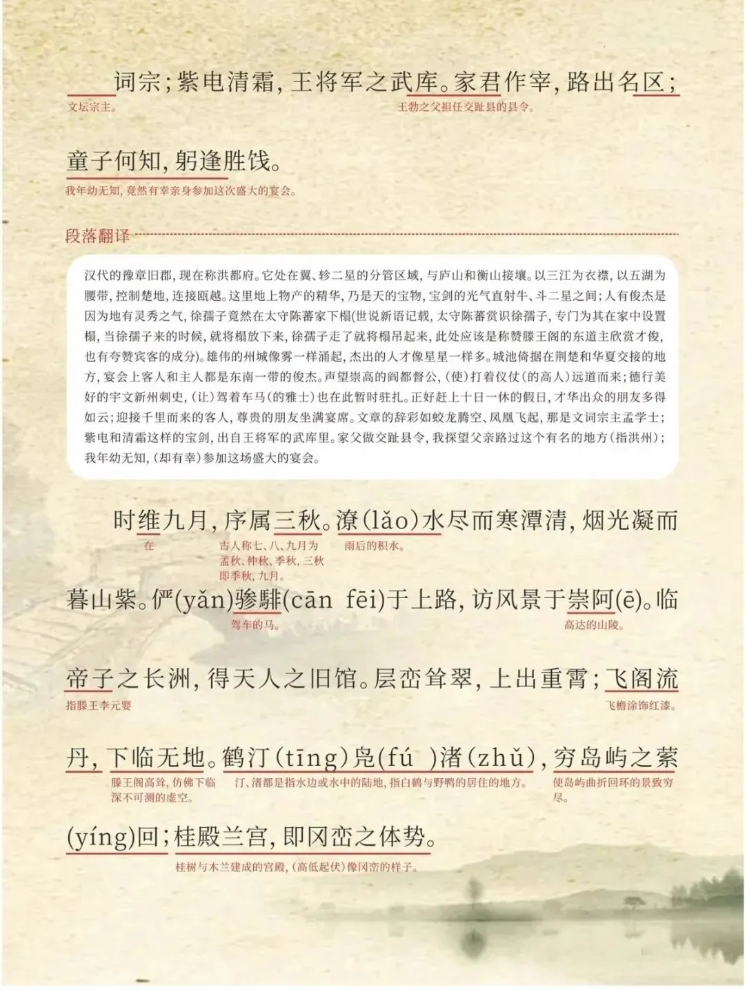✅ 小Tips:可以分段背诵,重点记熟“时维九月,序属三秋”到“爽籁发而清风生,纤歌凝而白云遏”的写景部分,以及“嗟乎!时运不齐,命途多舛”之后的抒情段落,更容易抓住记忆点。
