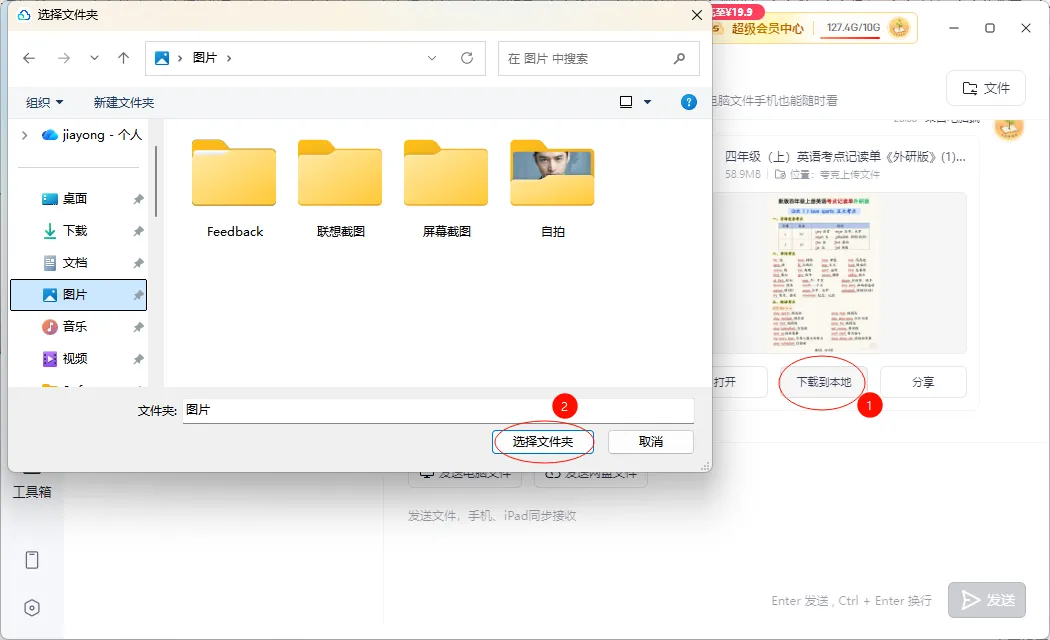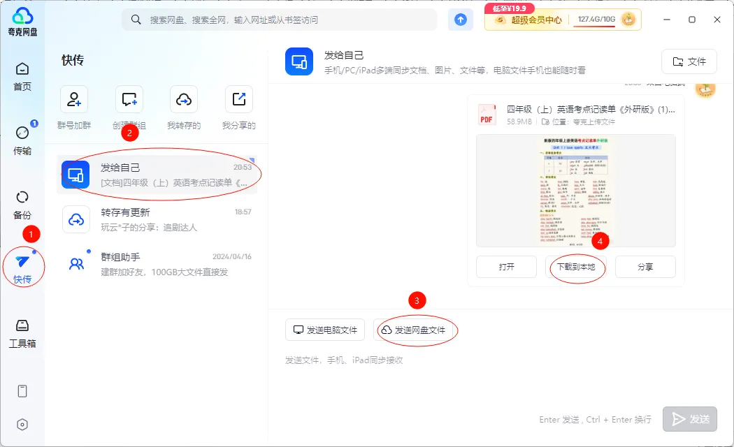 3、第三步在聊天窗口中点击『发送网盘文件』,再选择你需要下载的文件即可。