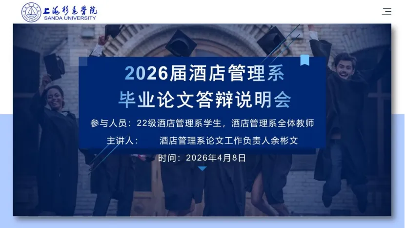 为优化本科毕业论文工作,助力国家一流专业建设,确保2026届毕业班学生毕业论文工作顺利推进,上海杉达学院酒店管理系于4月8日晚19:00,面向2022级全体学生在线召开了毕业论文答辩说明会。管理学院副院长苑炳慧、系副主任李娜娜与宁月等酒店管理专业教师,以及2022级酒店管理专业全体学生参加了本次会议。会议由酒店管理系毕业论文工作负责人余彬文老师主持。