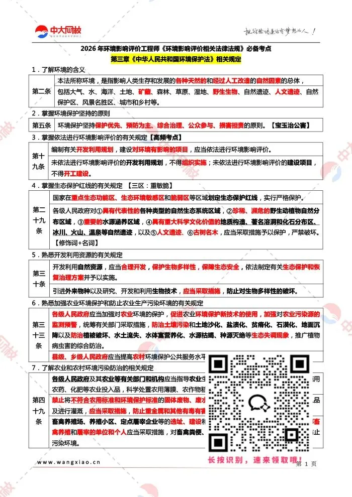 2026环评师备考已进入冲刺阶段,法规是提分关键。不用死啃书本、不用自己划重点,这份《环境保护法》核心考点帮你快速抓分、高效备考。