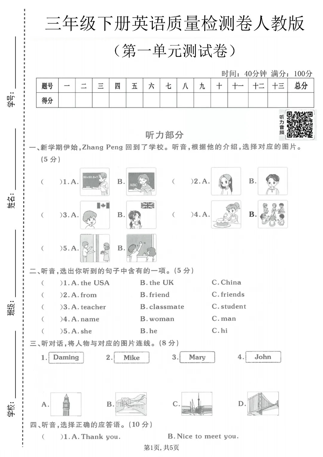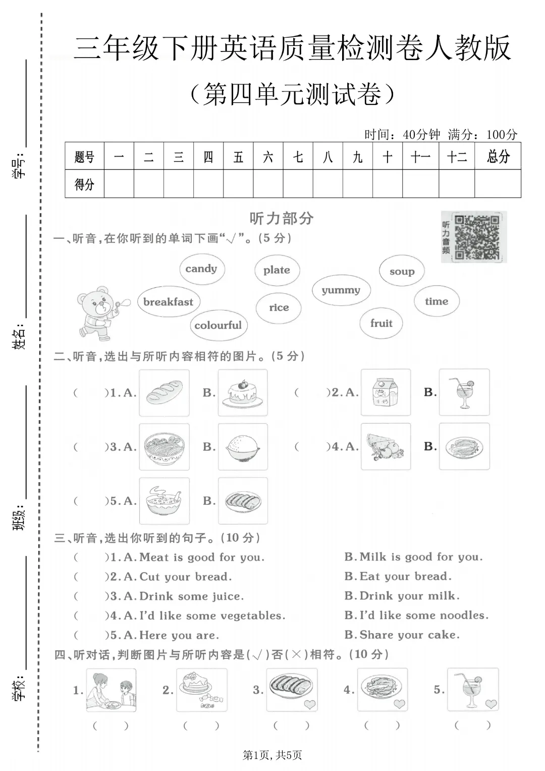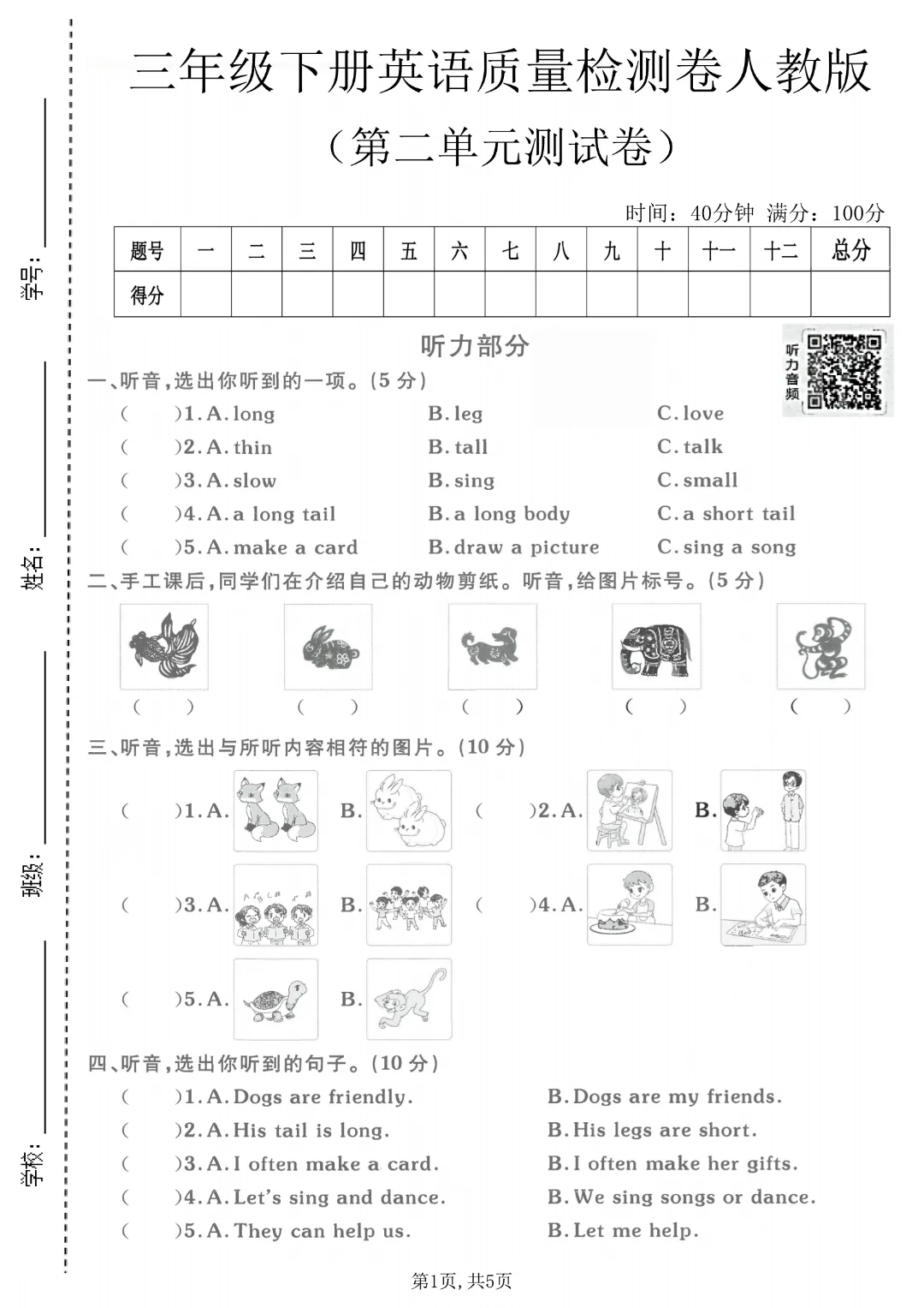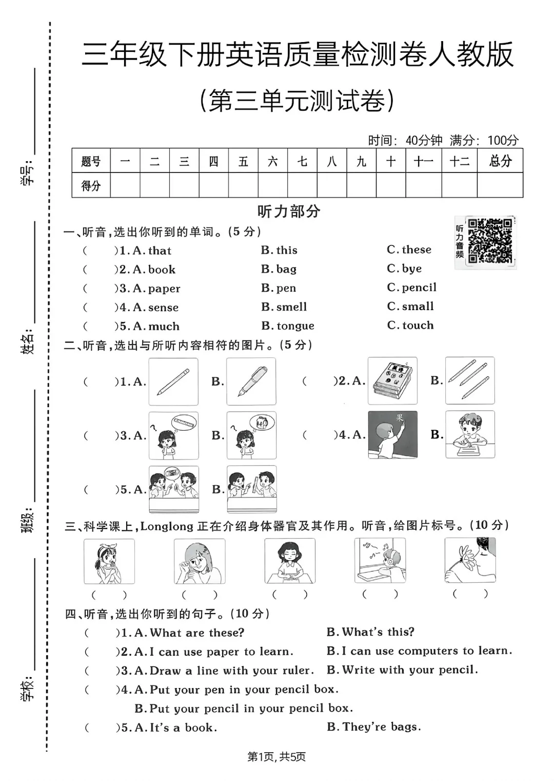 今天给家长们分享的是:26春三年级下册英语人教PEP版《第1-4单元测试卷+期中测试卷》带答案| 完整高清电子版可打印