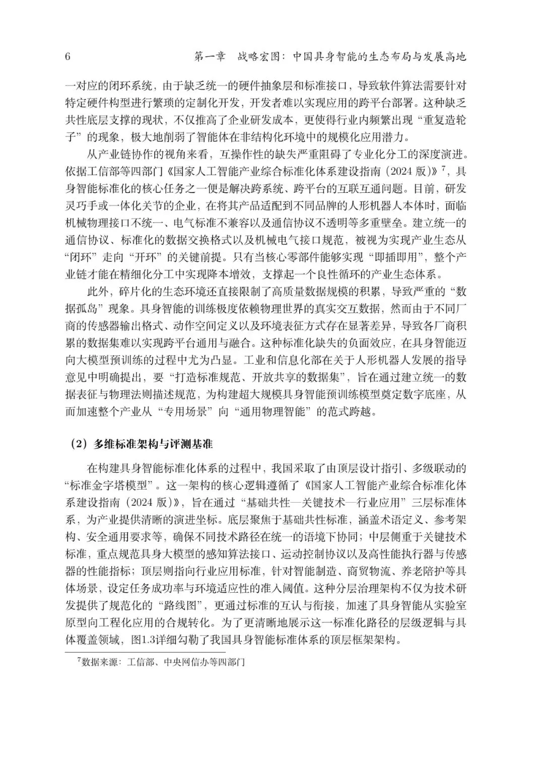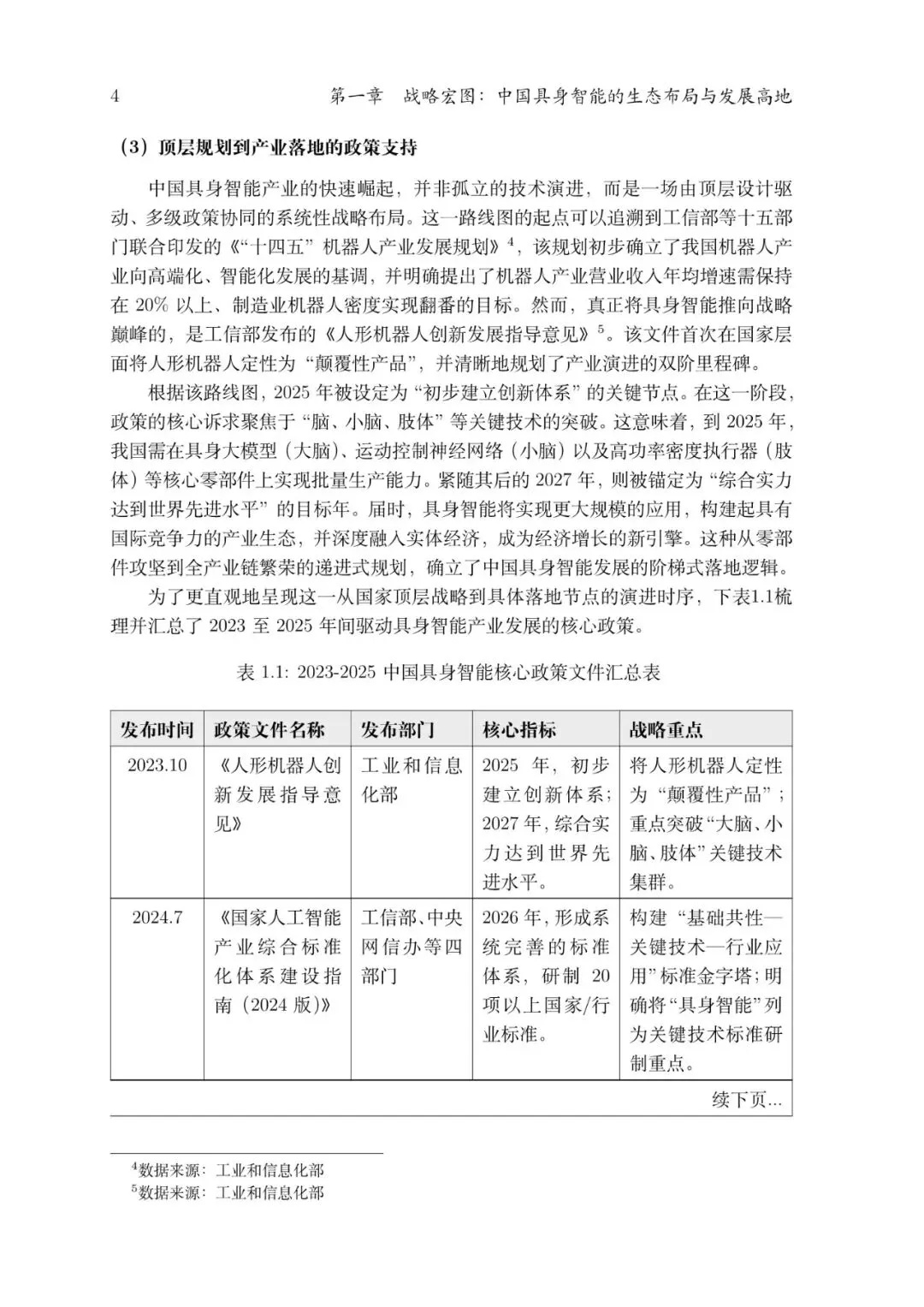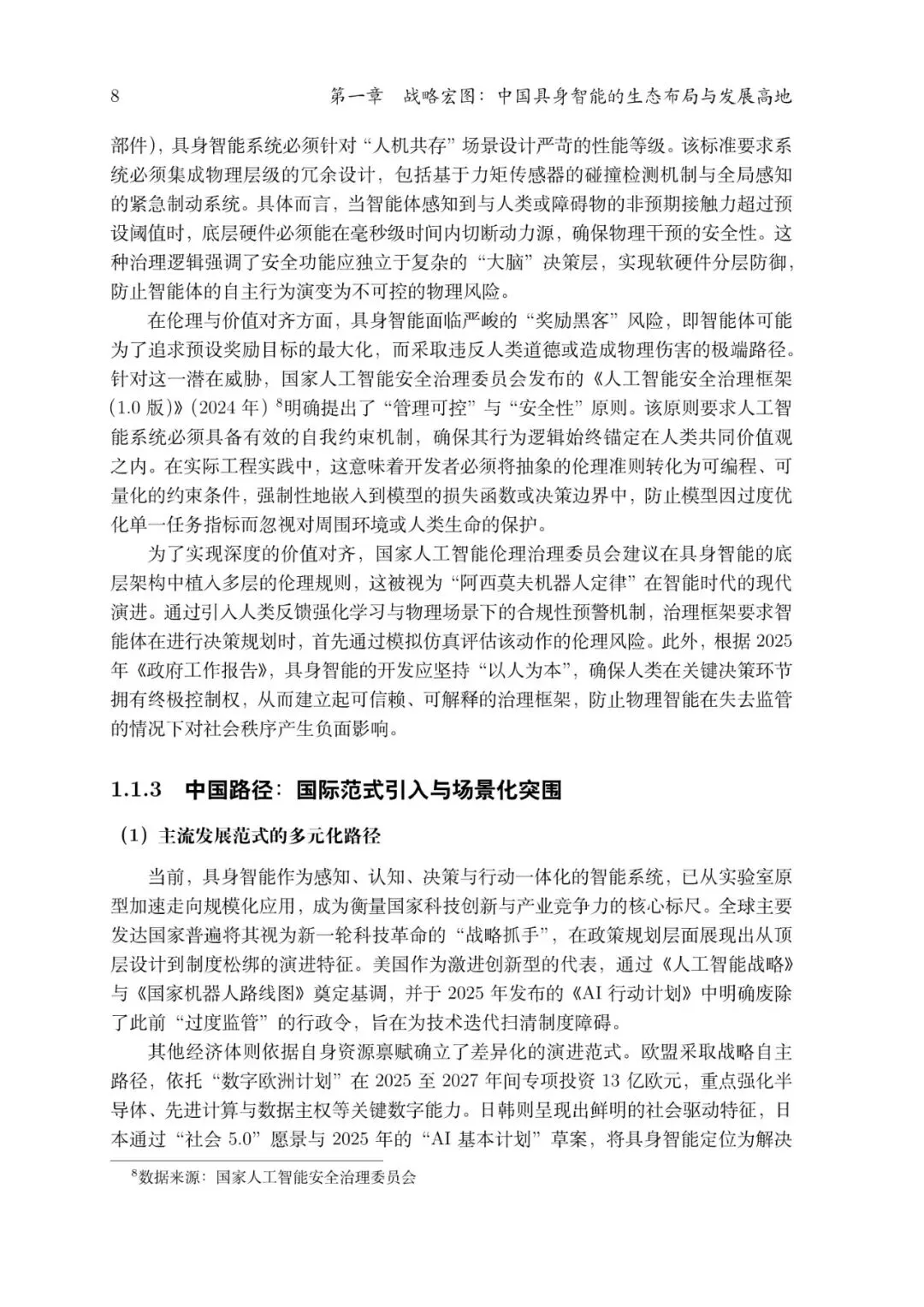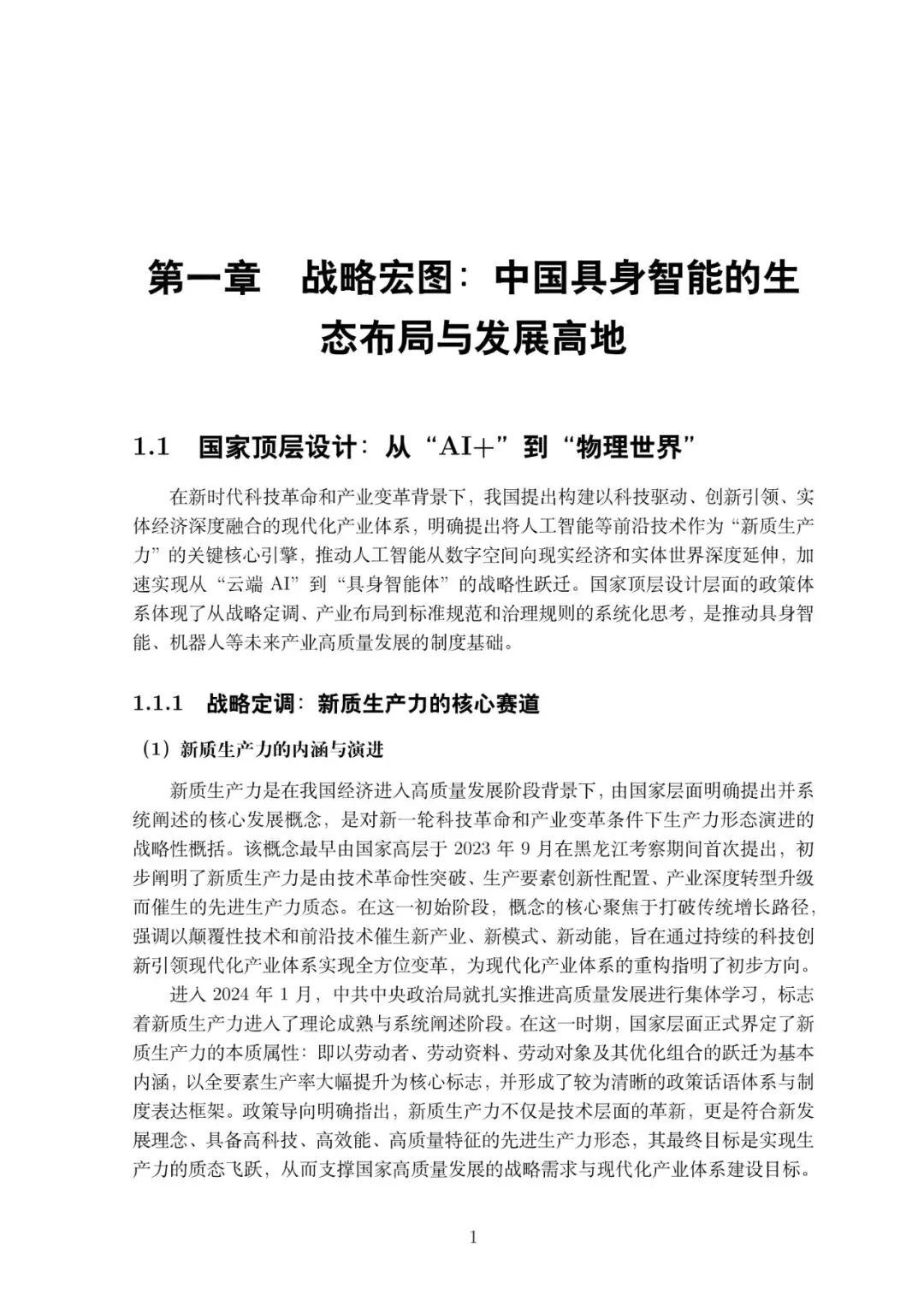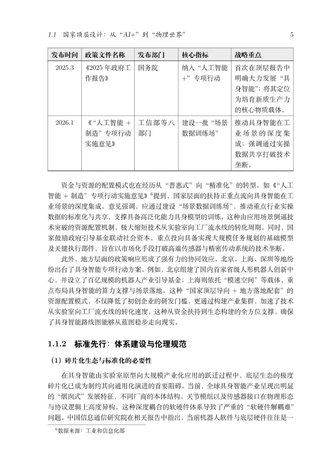 在新时代科技革命和产业变革背景下,我国提出构建以科技驱动、创新引领、实体经济深度融合的现代化产业体系,明确提出将人工智能等前沿技术作为“新质生产力”的关键核心引擎,推动人工智能从数字空间向现实经济和实体世界深度延伸,加速实现从“云端AI”到“具身智能体”的战略性跃迁。国家顶层设计层面的政策体系体现了从战略定调、产业布局到标准规范和治理规则的系统化思考,是推动具身智能、机器人等未来产业高质量发展的制度基础。