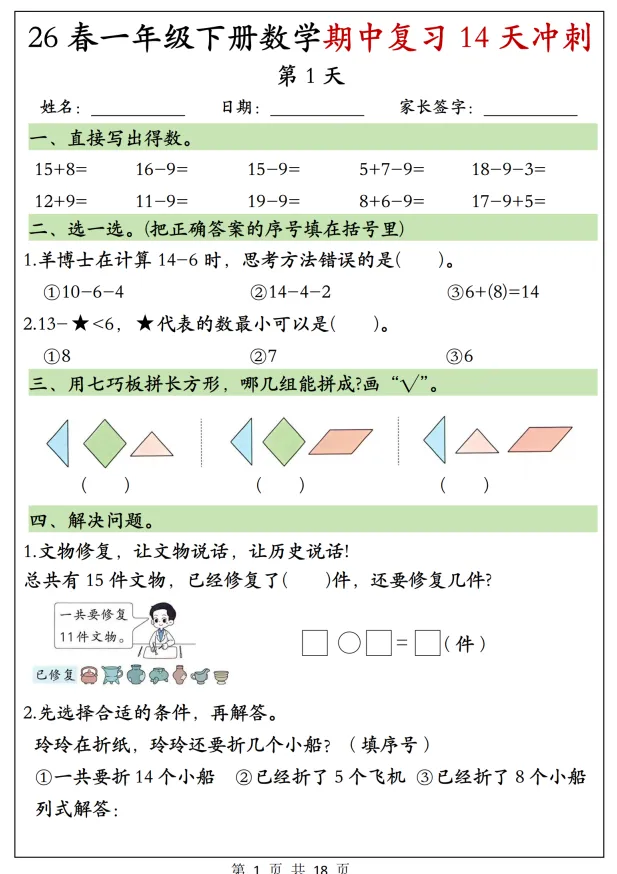 26(新版)一年级(下)数学期中复习冲刺共18页完整版,电子版高清可下载可打印。因篇幅有限,仅展示部分内容。有需要的家长快给孩子领取一份,让孩子练习吧!