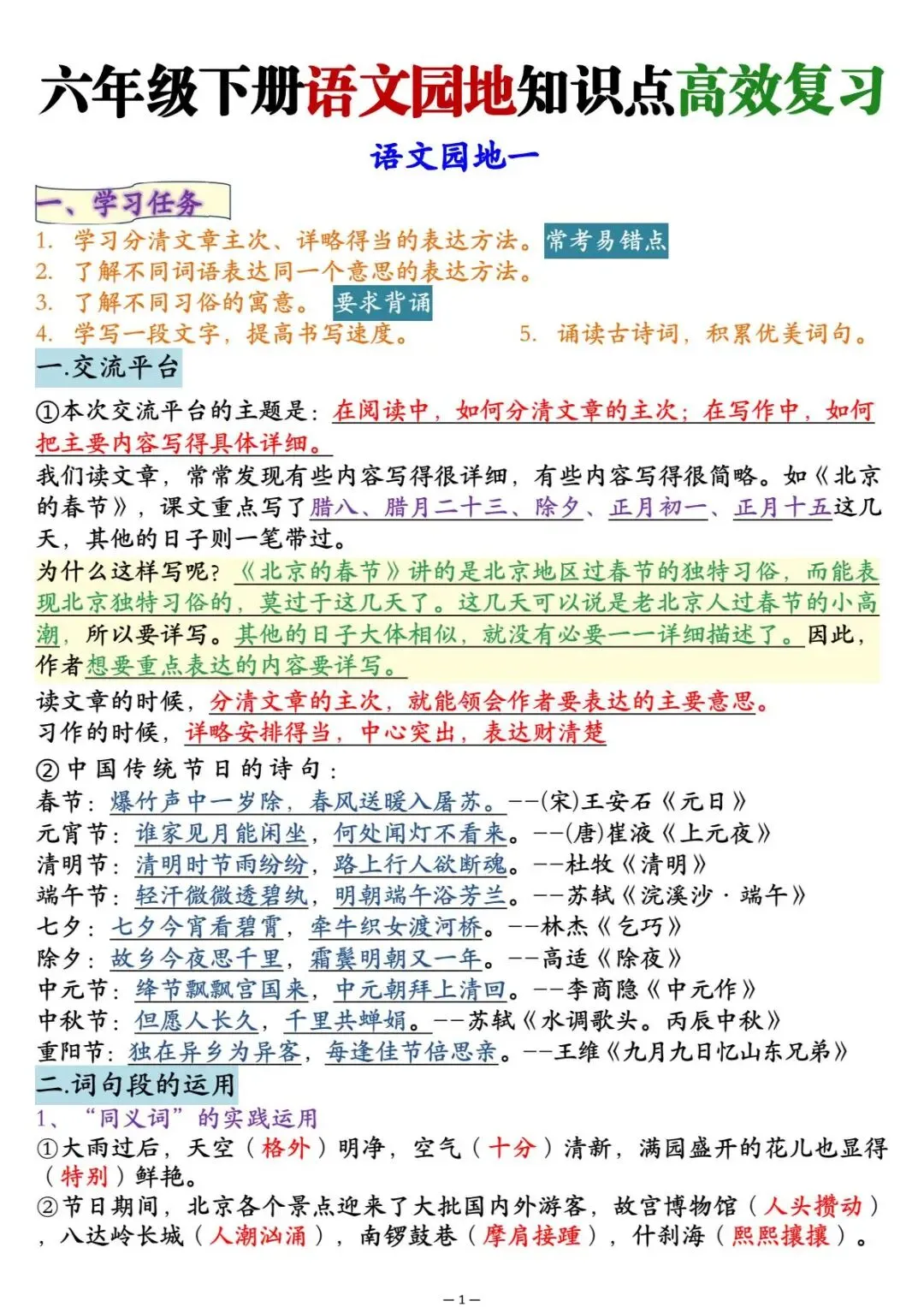 六年级下册《语文园地知识点高效复习》电子版可下载打印