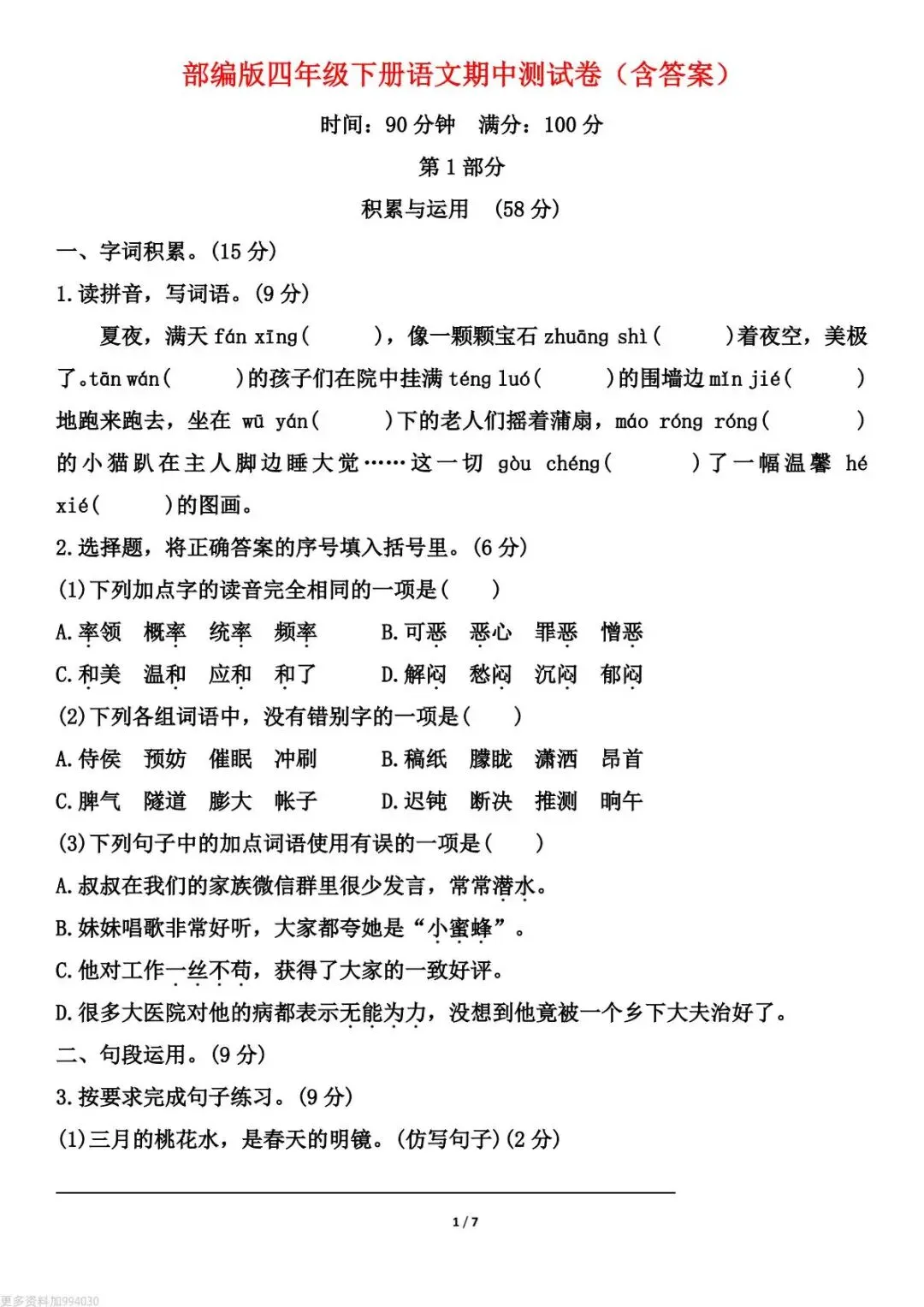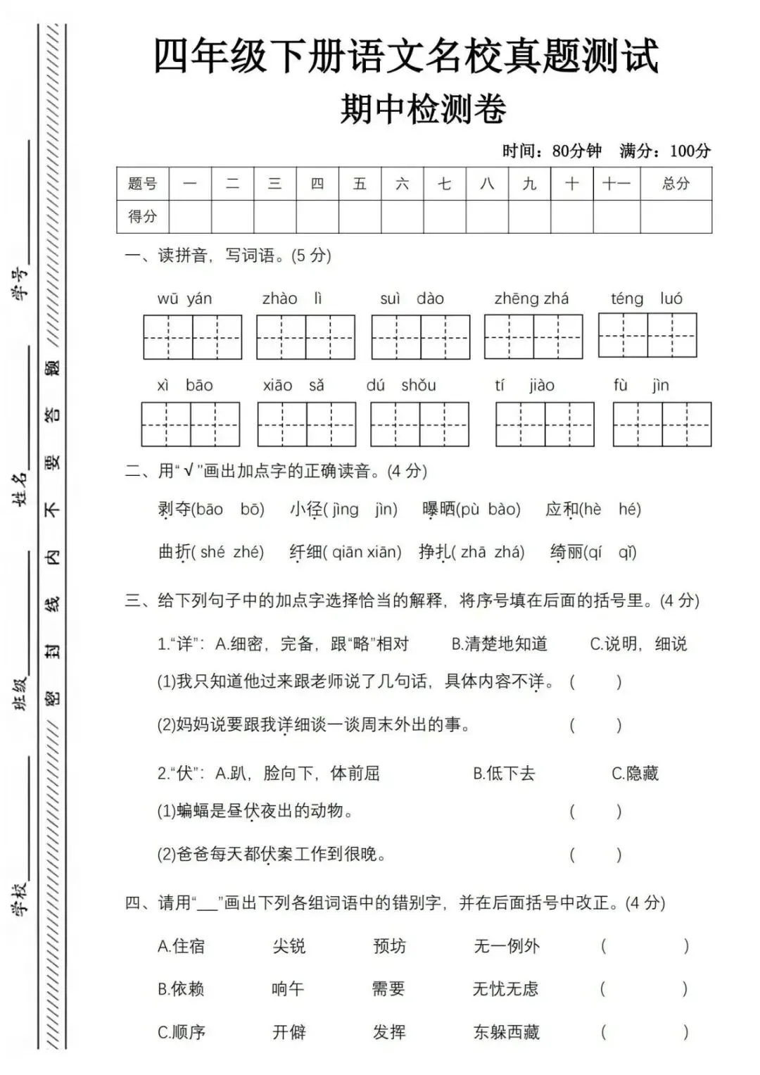 部编版四年级下册语文期中测试卷,共2套含答案,电子版可下载可打印