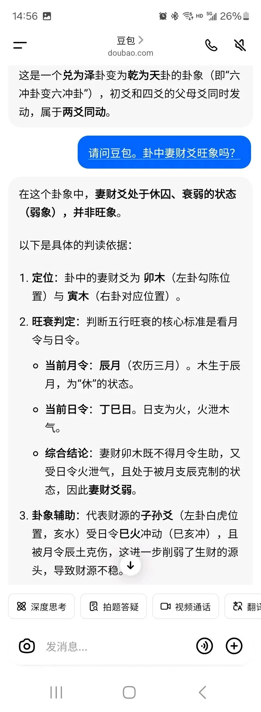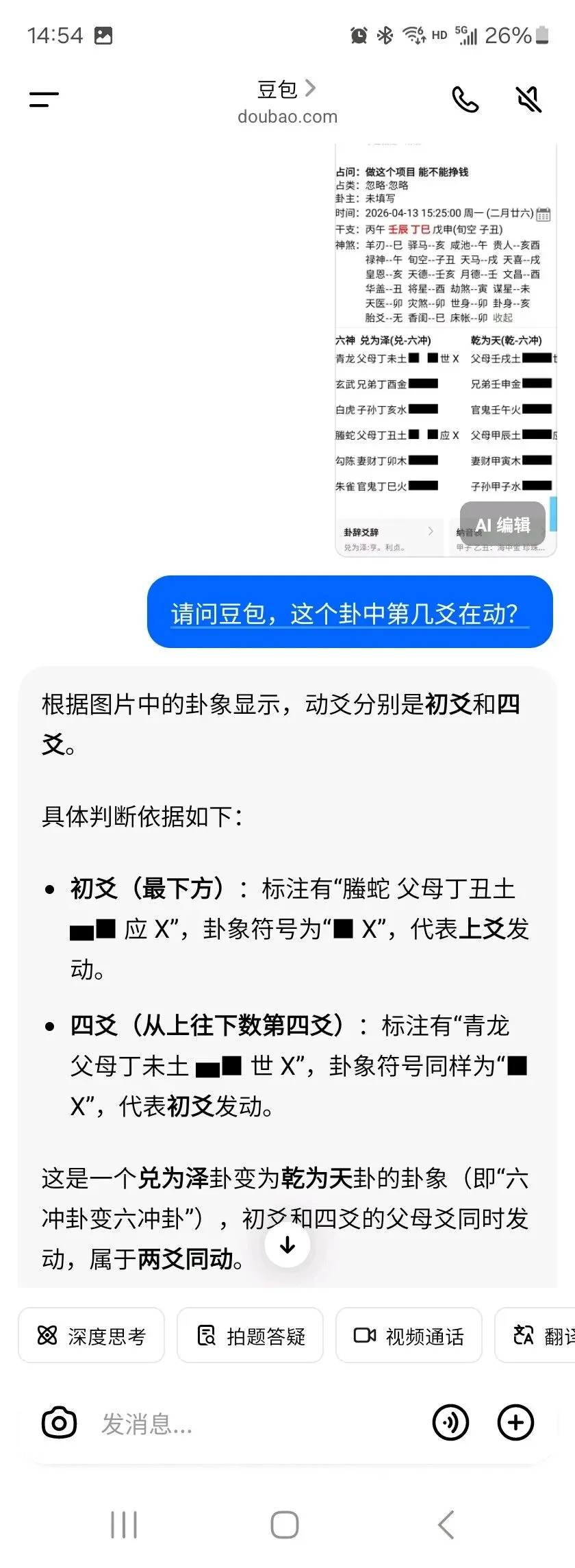 下面👇🏻案例是一位老客户找我断的一个卦,我断完之后,他又找豆包问一遍,豆包告诉他财爻很旺😓,可以赚钱。(本篇内容不分享断卦思路,只单纯指出错误❌)