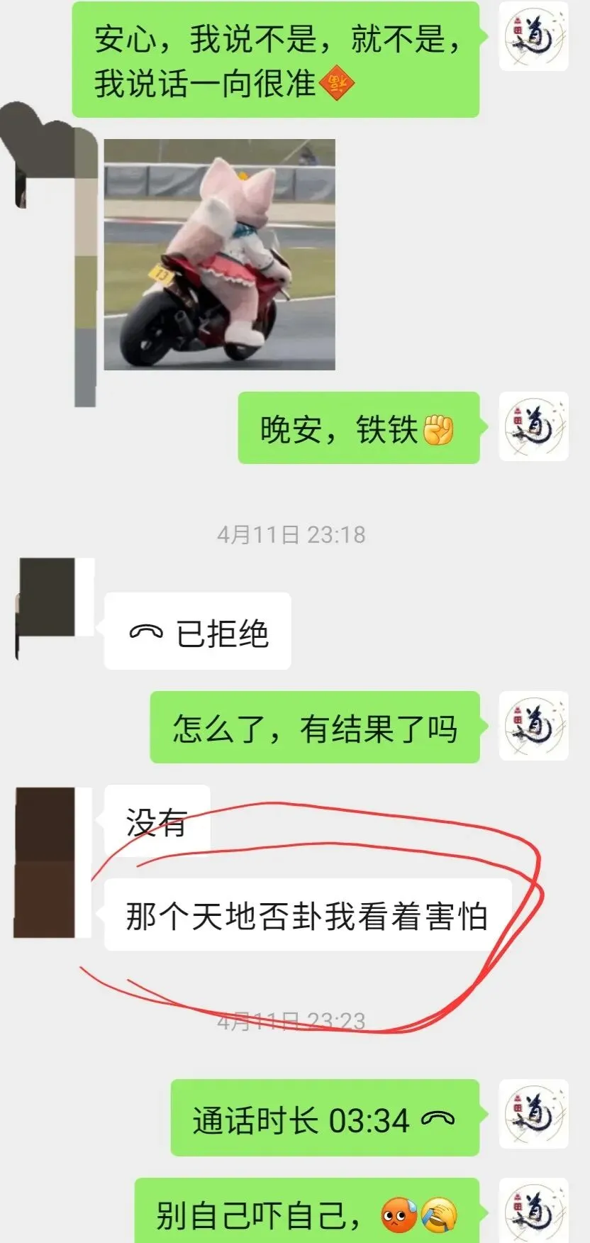 最后一个卦例,因为豆包说的内容,焦虑不安,半夜又给我发语音通话询问,说天地否卦不好,害怕,我又安慰了一番,问豆包的是在通话中说的,所以没有文字记录,请看下图