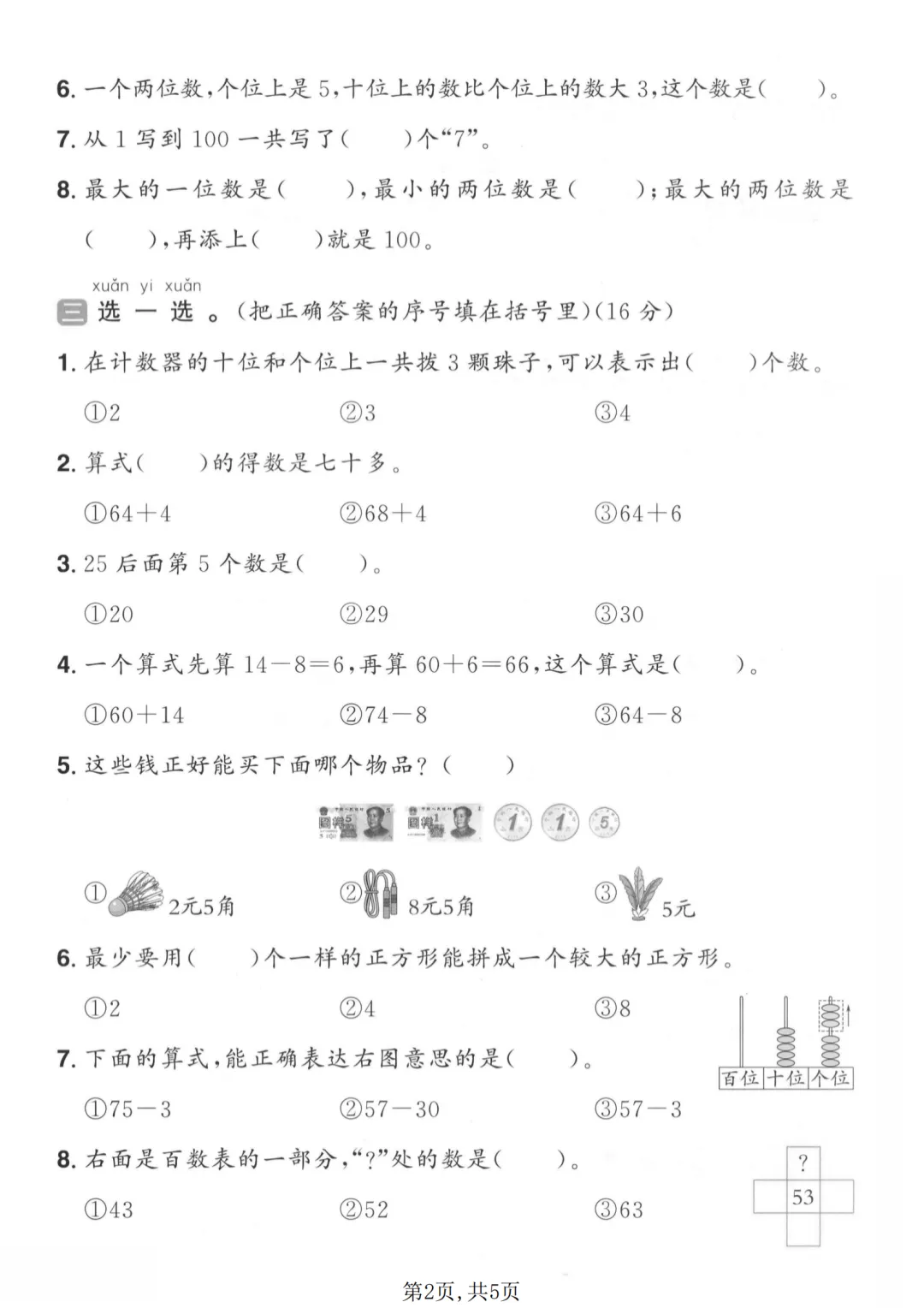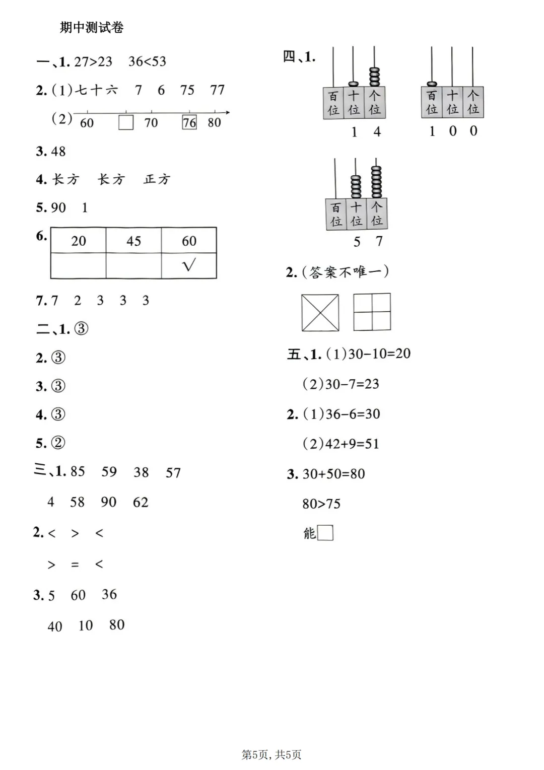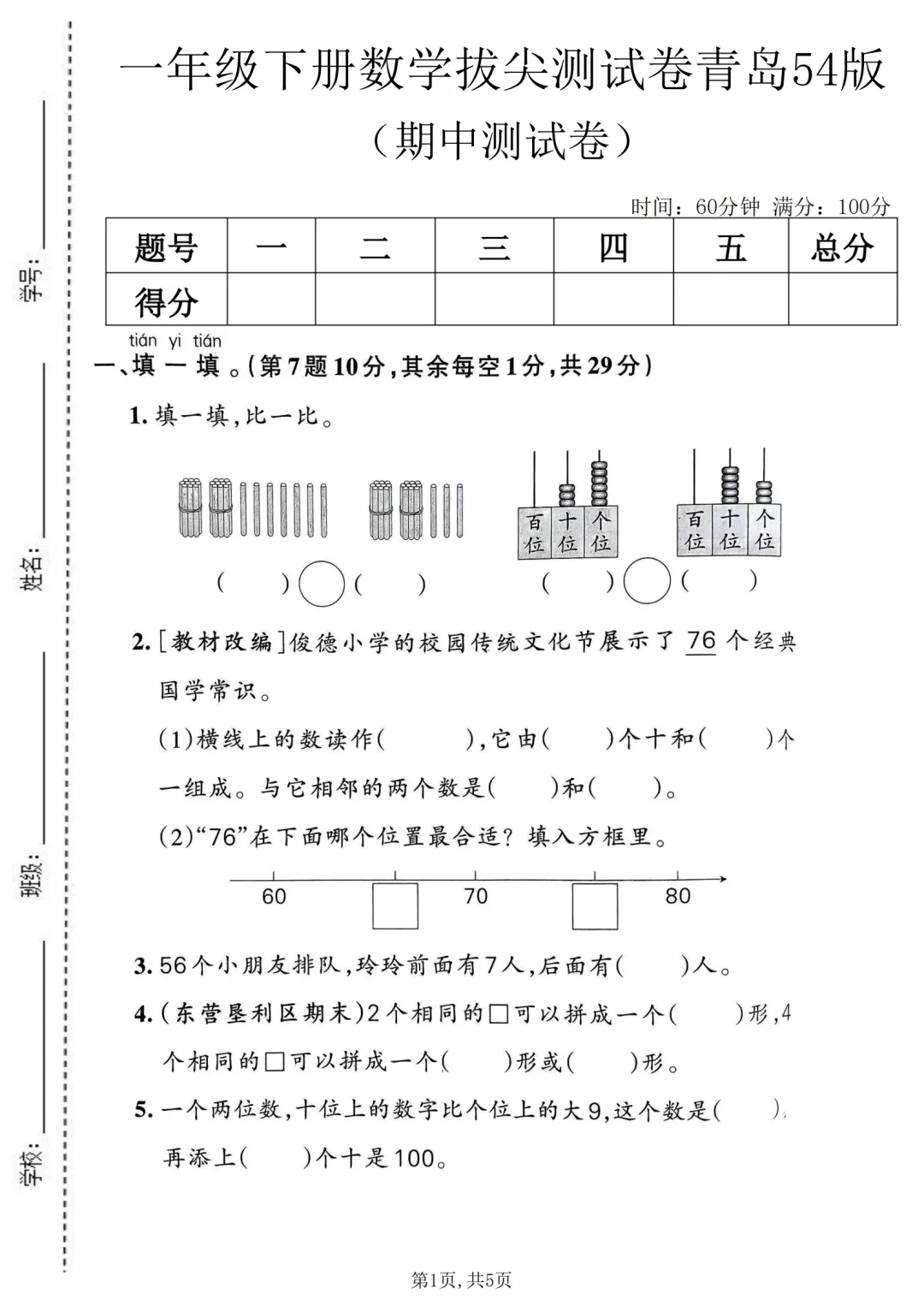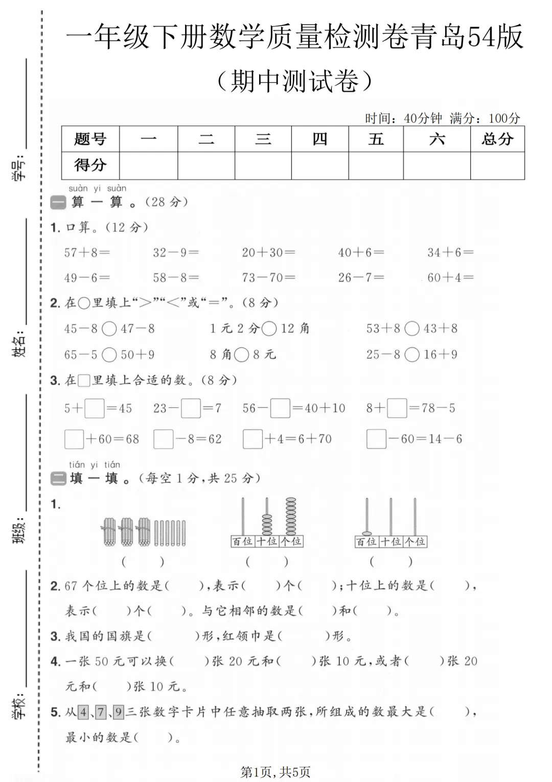 26年春一年级(下)数学 期中质量检测卷《青岛54版》。精准适配教材与考情:该试卷是专为青岛 54 制小学一年级下册数学设计的,精准对接教材教学重点和本地考情,避免了通用试卷考点脱节的问题,使练习更具针对性,能直击考点,提升学习实效。全面诊断与定位:通过系统的题目设置,试卷能全面考察学生对半个学期以来所学核心概念、基本技能的掌握情况,帮助师生发现学习中的优势与不足,为后续教学与学习找准发力点。巩固知识与强化记忆:测试过程中,学生需要调动已有的知识储备,这本身就是一个积极的复习与巩固过程,有助于将零散的知识点串联起来,形成更稳固的知识结构。分层设计满足不同需求:部分试卷采用 AB 卷分层设计,A 卷侧重基础巩固,紧扣教材单元知识点,精准覆盖每一课核心内容,帮孩子稳拿基础分,筑牢数学学习根基;B 卷侧重思维提优,结合高频考点与易错点,设计拓展性、综合性题型,助力孩子突破学习瓶颈,提升逻辑推理与综合解题能力。激发潜能与提升素养:设计巧妙的试题不仅能考察知识,更能激发学生的数学思维,培养其分析问题、解决问题的能力,渗透数学思想方法,提升数学核心素养。需要的家长抓紧打印出来,让孩子写一写,练一练吧。