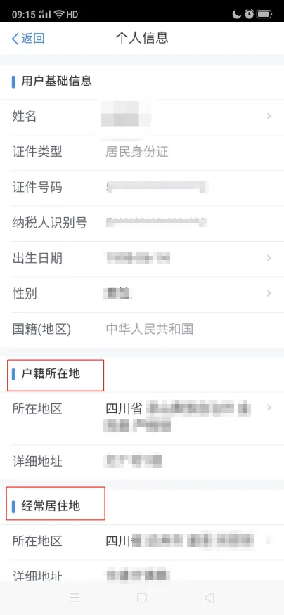 答:您可以先在手机个税APP【个人中心】登陆,点击【个人中心】-【个人信息】-【基本信息】,可以查询您已采集的“户籍所在地”、“经常居住地”、“联系地址”、“其他”等信息,如下图: