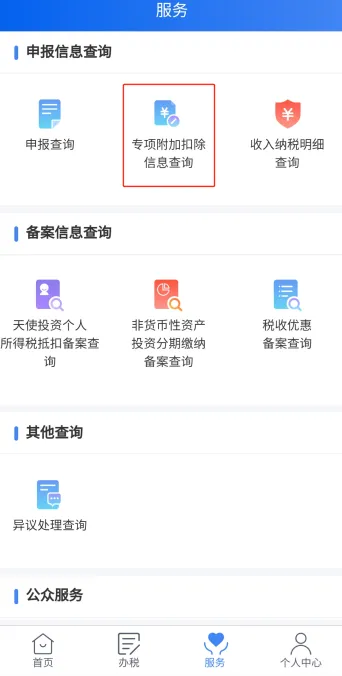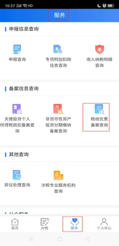 若您有残疾、烈属、孤老等可享受税收优惠情形,需要查询是否备案,可通过【服务】-【税收优惠备案查询】查询。
