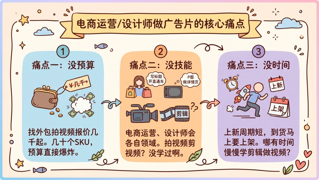 找外包拍一条产品视频,报价几千起步。店铺几十个SKU,全拍一遍预算直接爆炸。