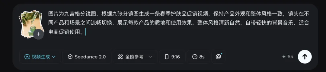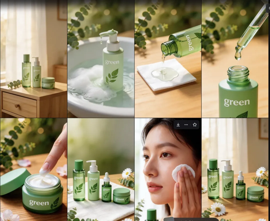 先用即梦生成一张包含多款产品的九宫格分镜图。以”春季护肤套装促销”为例: