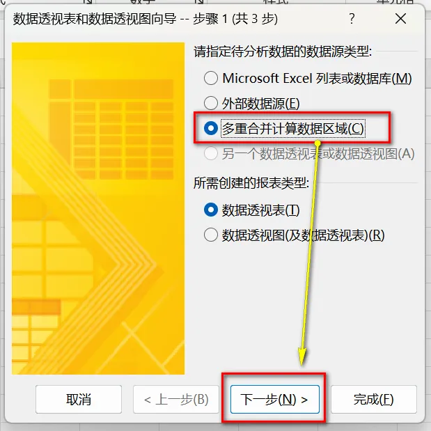 第一步:按住Alt键,先按d键,再按P键,调出“数据透视表和数据透视图向导”对话框,如下图,选中“多重合并计算数据区域(C)”,然后点击下一步。