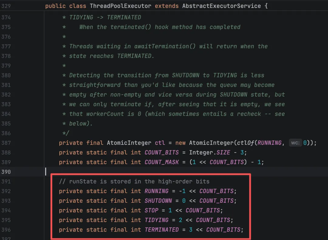 // 线程池状态(高3位)private static final int RUNNING = -1 << COUNT_BITS; // 11100000000000000000000000000000private static final int SHUTDOWN = 0 << COUNT_BITS; // 00000000000000000000000000000000private static final int STOP = 1 << COUNT_BITS; // 00100000000000000000000000000000private static final int TIDYING = 2 << COUNT_BITS; // 01000000000000000000000000000000private static final int TERMINATED = 3 << COUNT_BITS; // 01100000000000000000000000000000// 工作线程数(低29位)private static final int COUNT_BITS = Integer.SIZE – 3; // 32 – 3 = 29private static final int CAPACITY = (1 << COUNT_BITS) – 1; // 2^29 – 1// ctl字段(高3位:线程池状态,低29位:工作线程数)private final AtomicInteger ctl = new AtomicInteger(ctlOf(RUNNING, 0));// 获取线程池状态private static int runStateOf(int c) { return c & ~CAPACITY;}// 获取工作线程数private static int workerCountOf(int c) { return c & CAPACITY;}