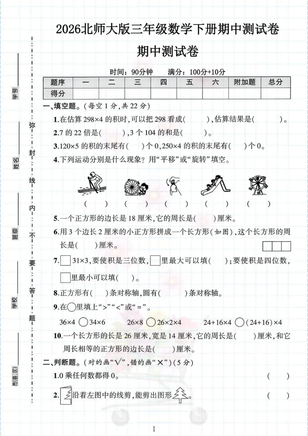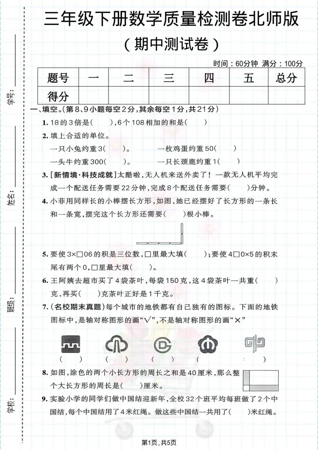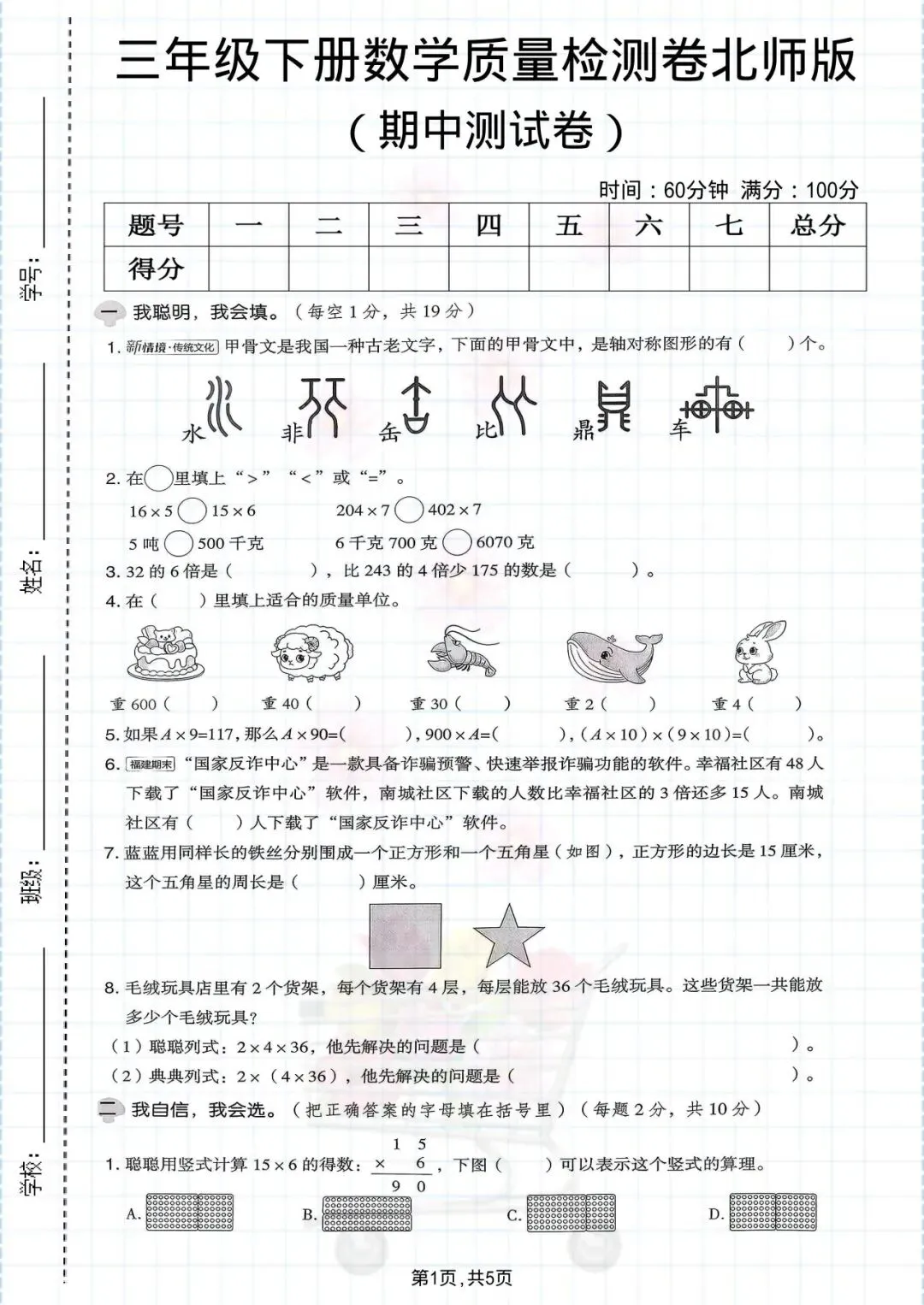 大家好!今天为大家分享的是;2026年春三年级下册北师大版数学《期中检测试卷、拔尖卷、期中考试真题试卷》共5套含答案,电子版可打印