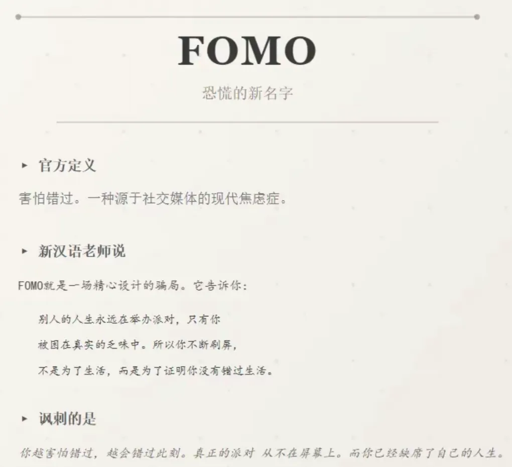 官网定义是害怕错过,个人感觉可以理解成小时候害怕小伙伴们集体出去玩没叫上我,现在成年了害怕被时代的浪潮拍打在沙滩上,犹如父辈错过改革开放的风,自己也错失一波波时代的浪潮。