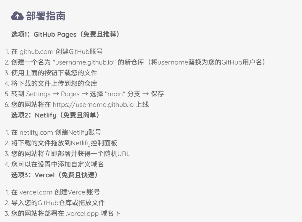 网站html文件做好了还不算完,做到这一步还只能你自己本地看,要想让大家通过链接点开就能看,你还需要部署到线上,这里AI也给了几种上线方式,是不是看到这么多步骤已经满头大汗了,尤其是下面各类网站还指不定有各种限制,包括网络、语言不通不知道点哪里等等。