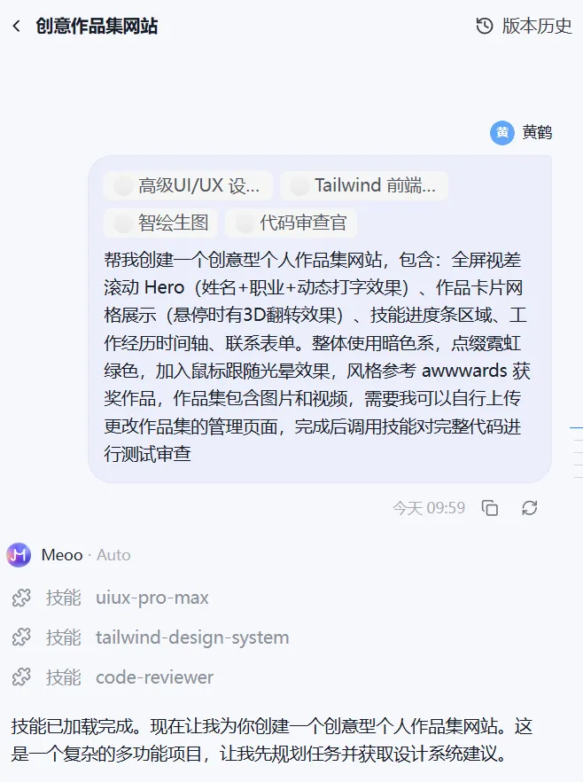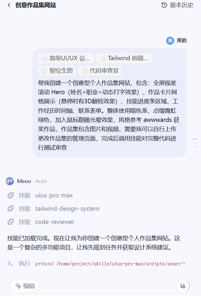 言归正传,秒悟给我最大的感受就是生成速度很快,我记得上次做作品集网站,加上模型思考的时间,做了一下午,但是秒悟短短十几分钟就做好了,从技能加载到文件创建再到执行构建,非常丝滑,而且最后成品完成度很高,不需要二次修改(对我个人做demo而言)。