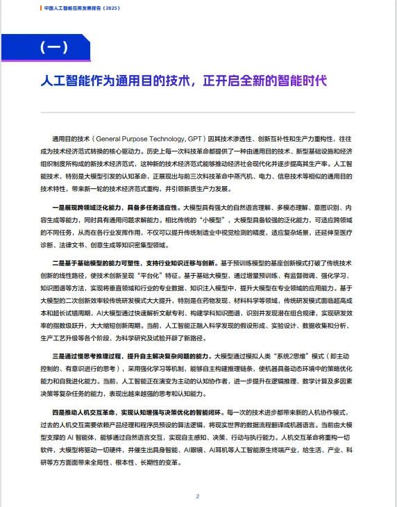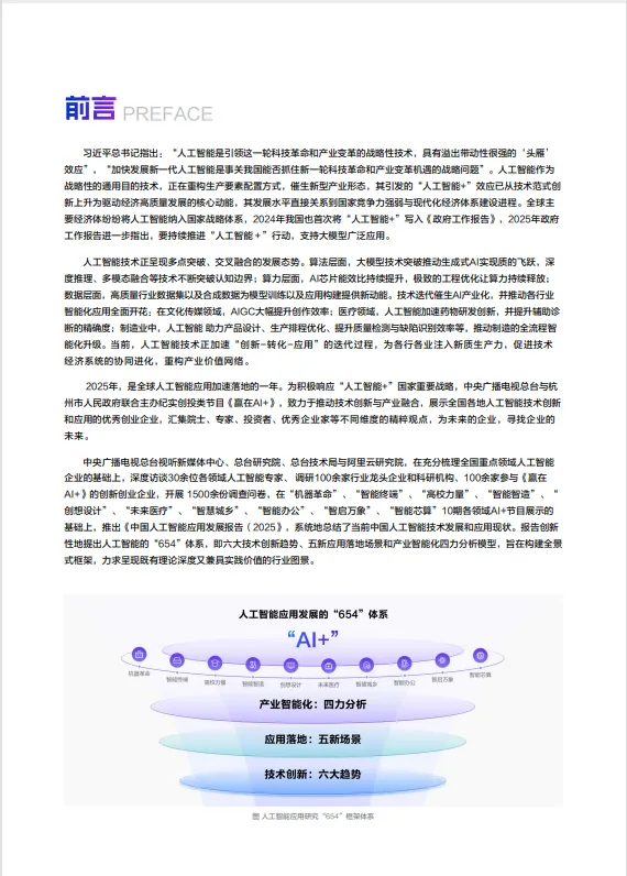 人工智能(AI)作为引领新一轮科技革命和产业变革的战略性技术,正在全球范围内引发深刻变革。习近平总书记指出,人工智能是具有“头雁”效应的战略性技术,加快发展新一代人工智能是我国抓住新一轮科技革命机遇的关键。2024年,“人工智能+”首次被写入我国《政府工作报告》,2025年进一步强调持续推进“人工智能+”行动,支持大模型广泛应用。在此背景下,《中国人工智能应用发展报告(2025)》应运而生,系统总结了中国人工智能技术发展和应用现状,提出了“654”体系,即六大技术创新趋势、五新应用落地场景和产业智能化四力分析模型,为理解中国人工智能的发展提供了全景式框架。