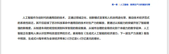 生成式人工智能通过自动化生成高质量内容和数据,显著降低了企业在文档处理、内容创作、产品设计、市场研究等方面的成本和人力依赖,为企业带来更高的运营效率。具体应用包括: