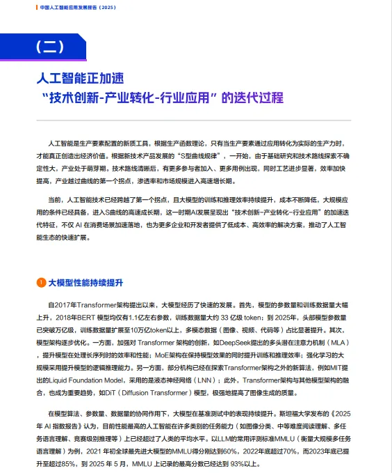 大模型性能持续提升:自2017年Transformer架构提出以来,大模型的参数量和训练数据量大幅增加,模型架构不断优化,推理能力显著提升。例如,斯坦福大学发布的《2025年AI指数报告》显示,大模型在多任务语言理解(MMLU)等基准测试中的表现已经超过人类平均水平。