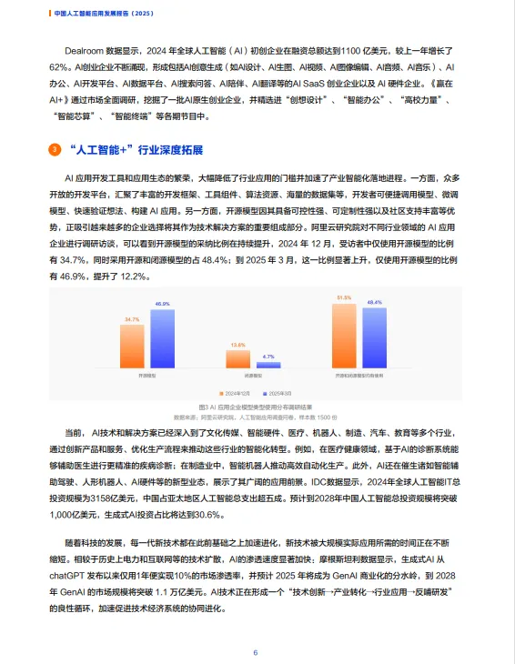 “人工智能+”行业深度拓展:AI应用开发工具和生态的繁荣降低了行业应用门槛,加速了产业智能化落地进程。开源模型的采纳比例持续提升,AI技术已经深入到文化传媒、智能硬件、医疗、机器人、制造、汽车、教育等多个行业。