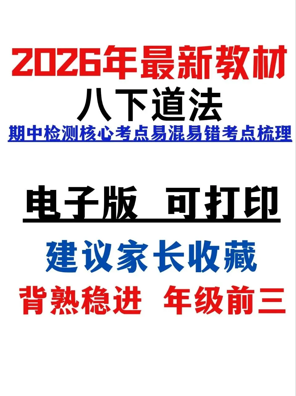 这份资料是按照八下期中考点专门整理的,把必背核心知识点、高频考点、易混易错点全部梳理清楚,不用自己翻书总结,复习更有方向。每天花时间读一读、记一记,把易混点对比着背,理解更透彻,记忆更牢固。