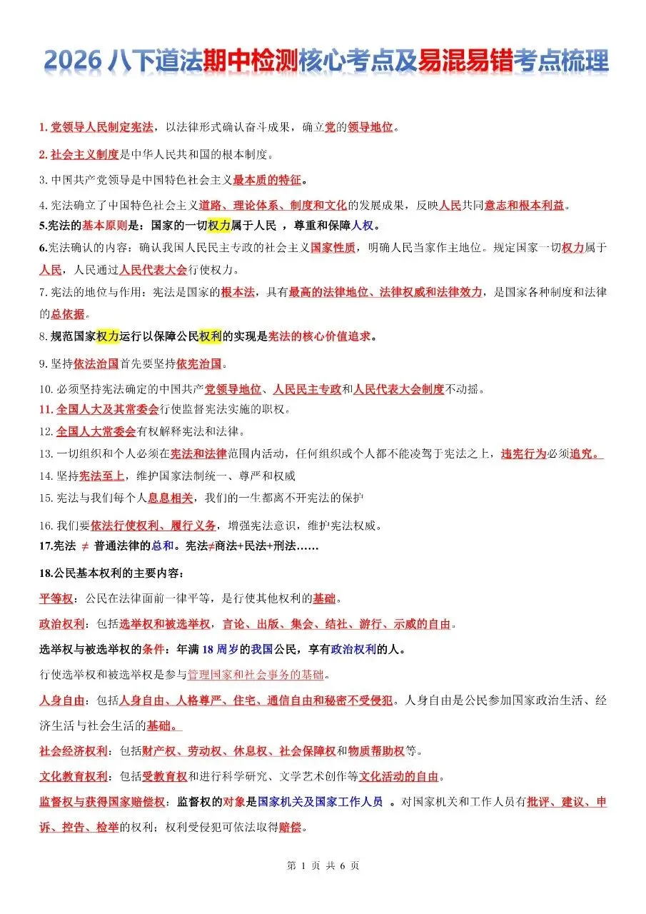 帮我写作,帮我如何利用老师整理好2026年最新教材八下道法期中检测核心考点、易混易错考点梳理,预习冲刺好帮手,考试直接拿满分,背熟考试稳拿年级第一,考试轻松拿满分。