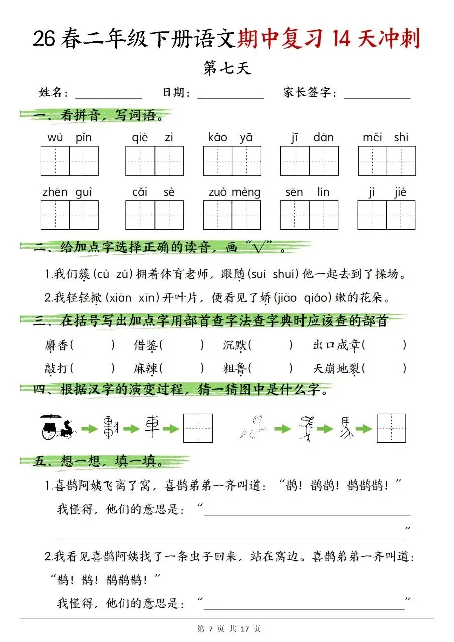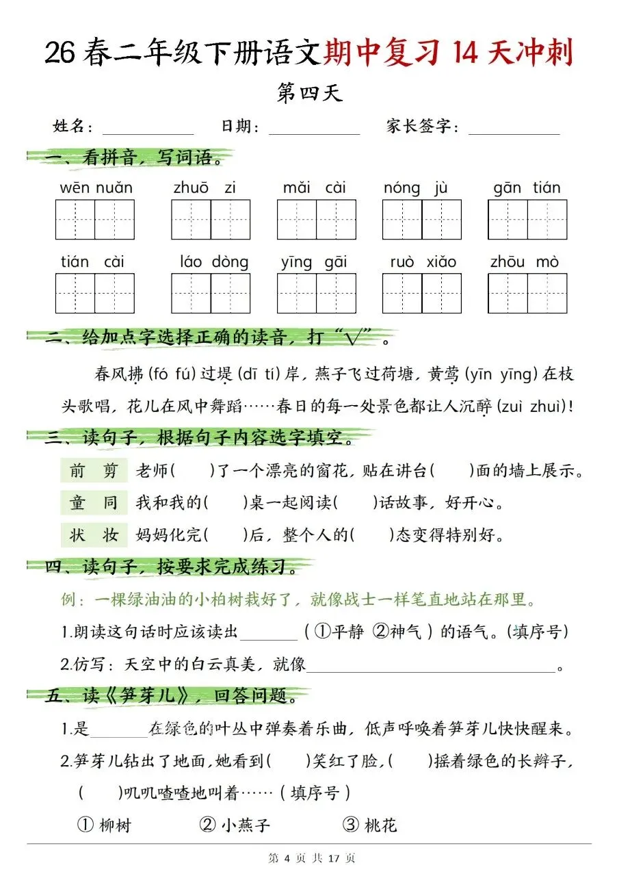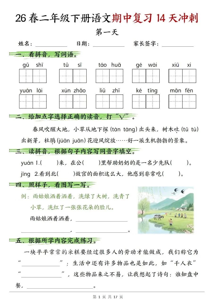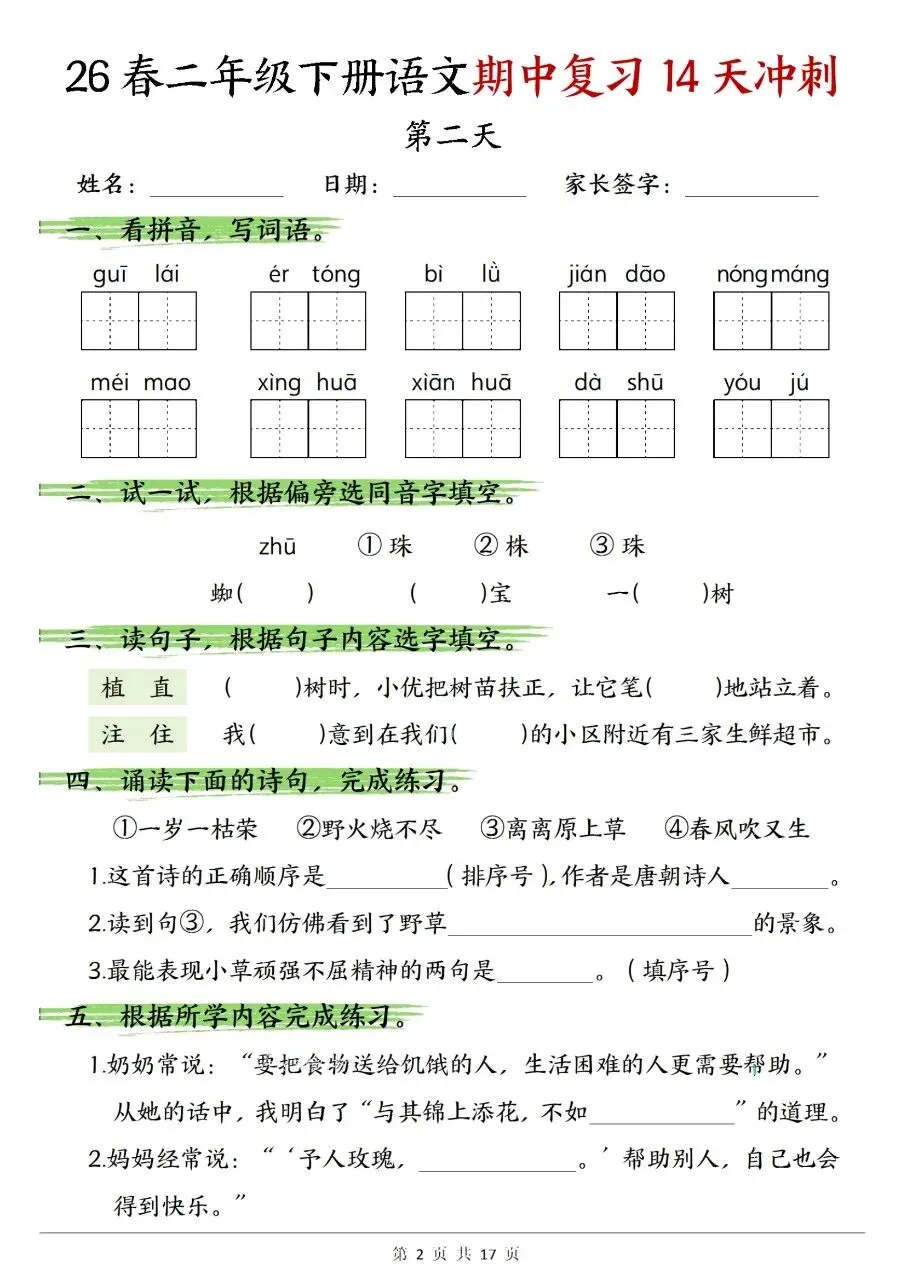 二年级下册语文期中复习14天冲刺含答案可打印