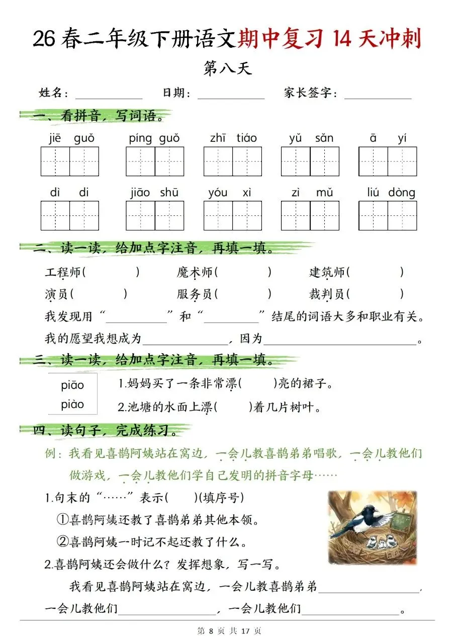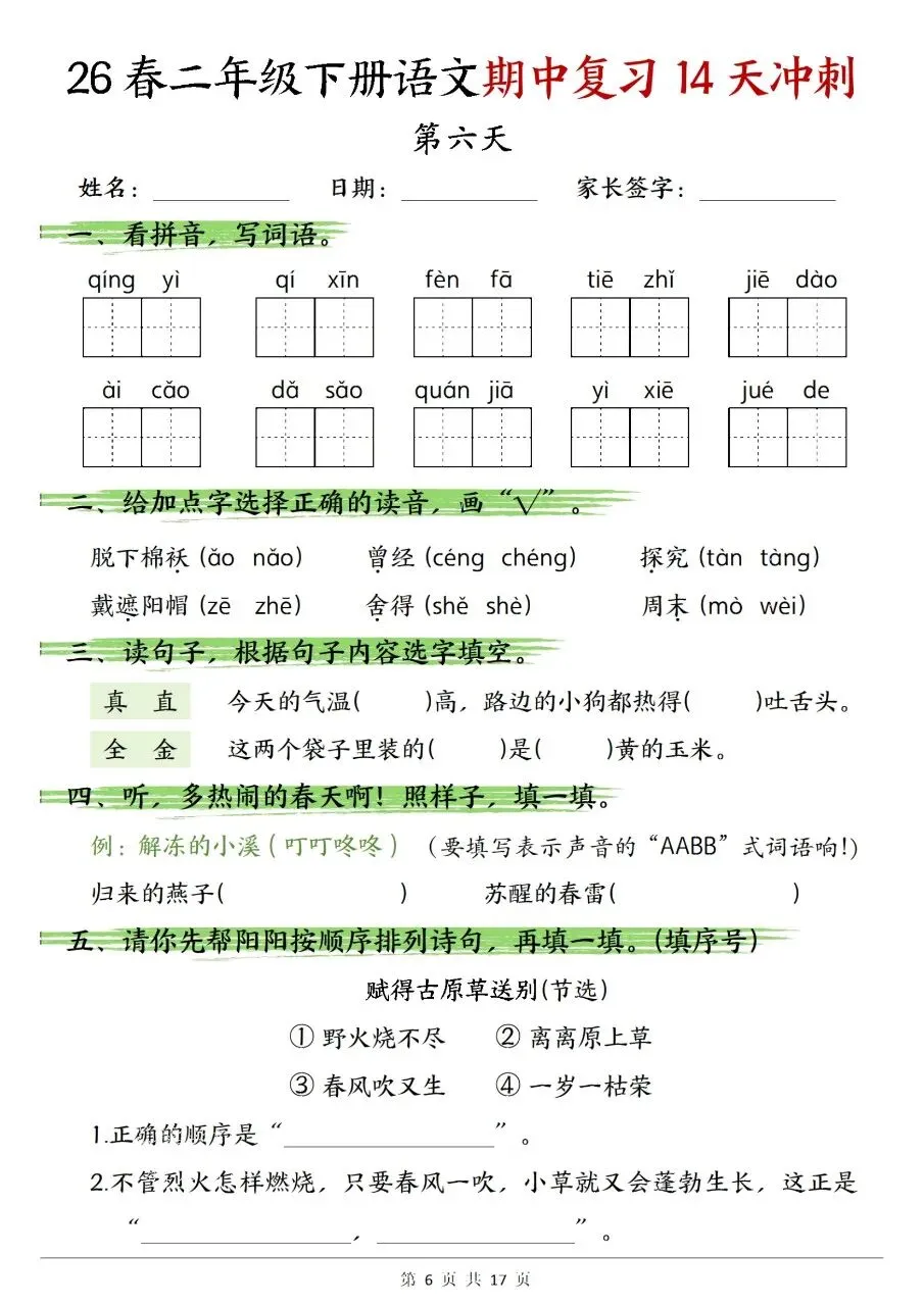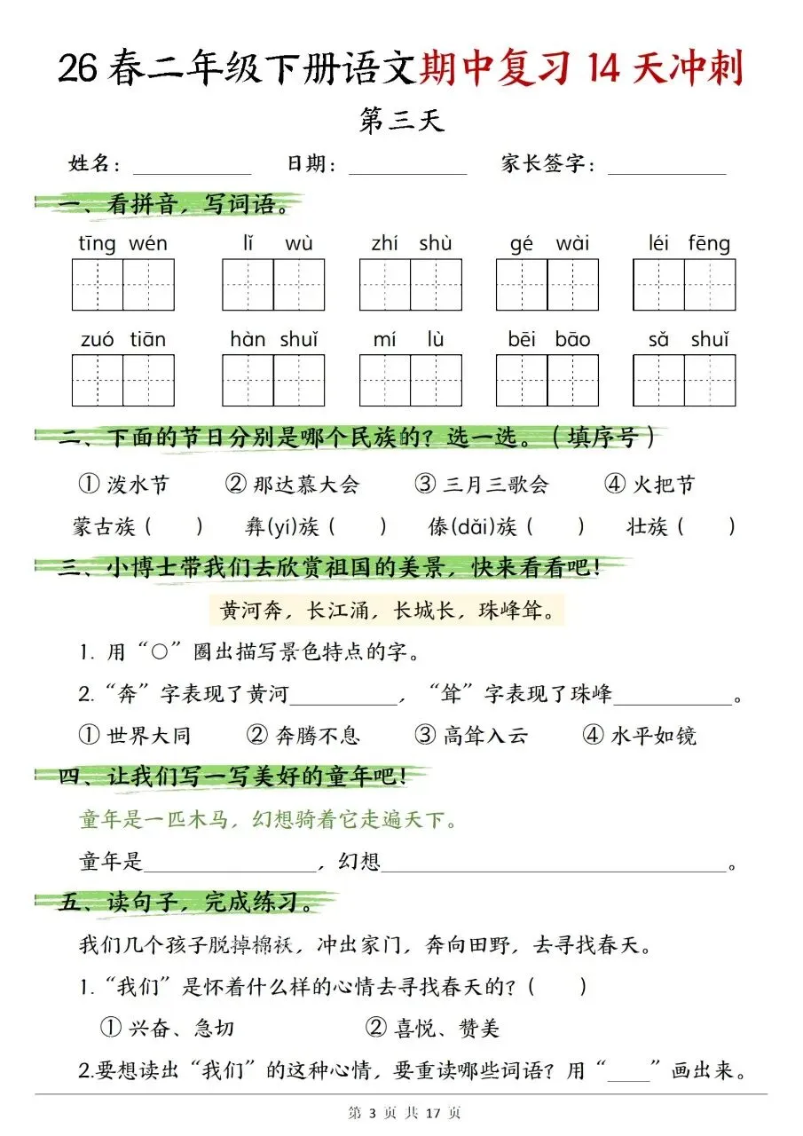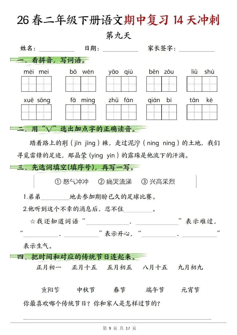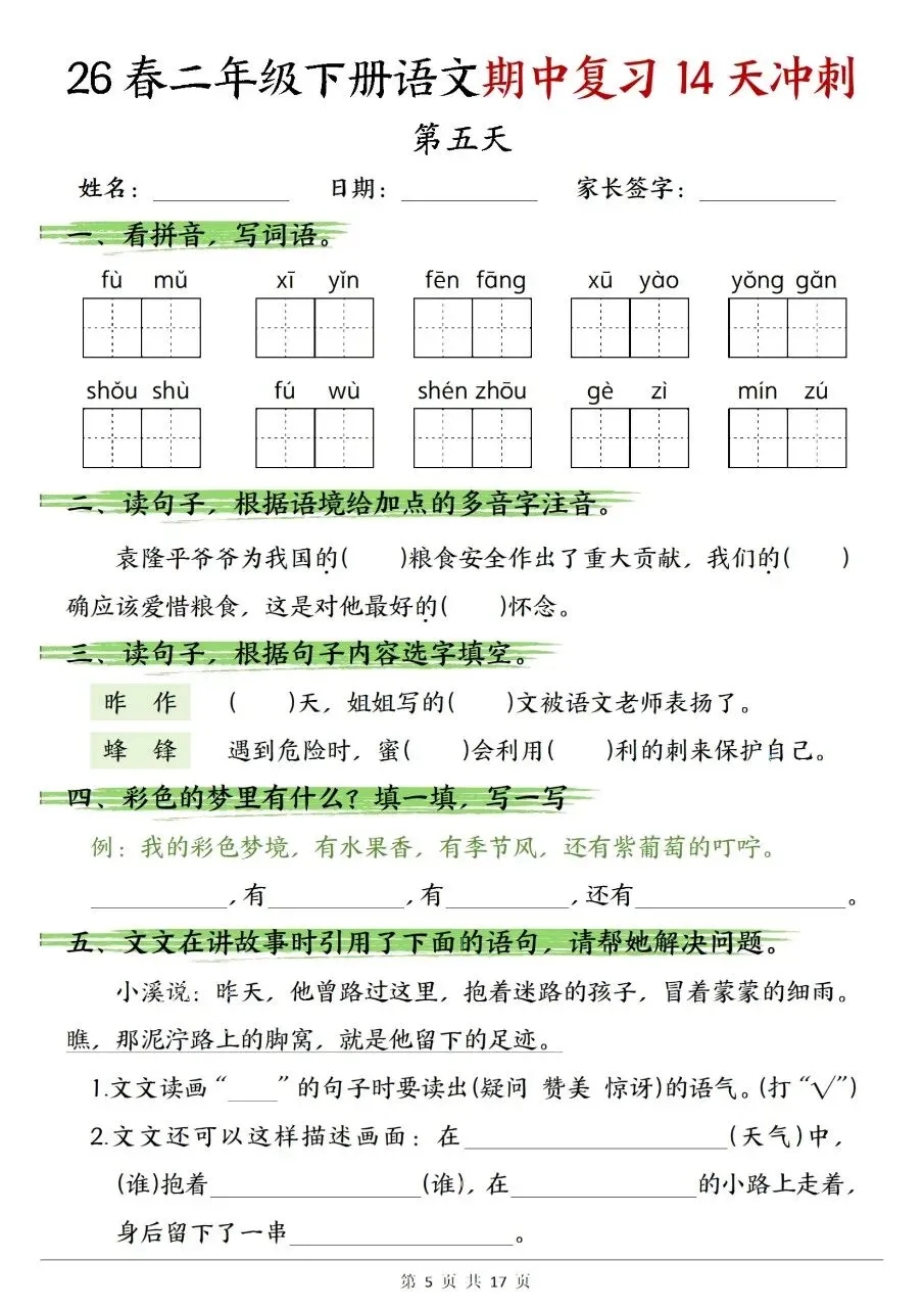二年级下册语文期中复习14天冲刺含答案可打印