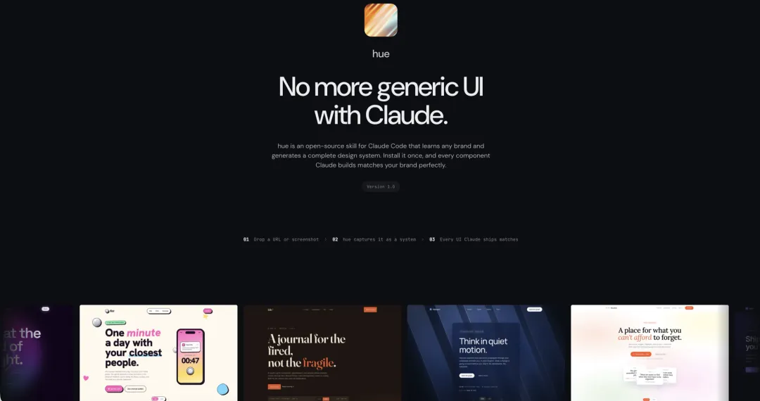 今天,我们要向大家推荐一个专为 Claude Code 打造的“视觉捕捉神器”——Hue(色调)。只需提供一个 URL 或一张截图,它就能瞬间提取出完整的品牌视觉规范,并生成一套可直接运行的组件库!