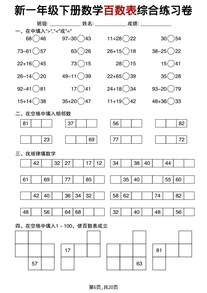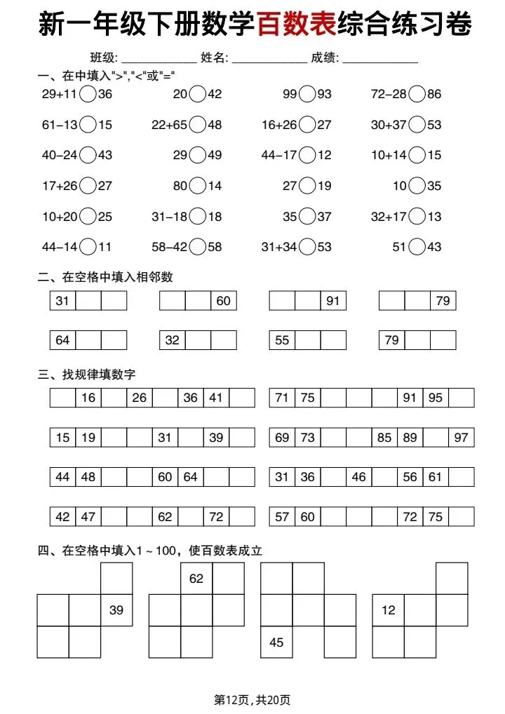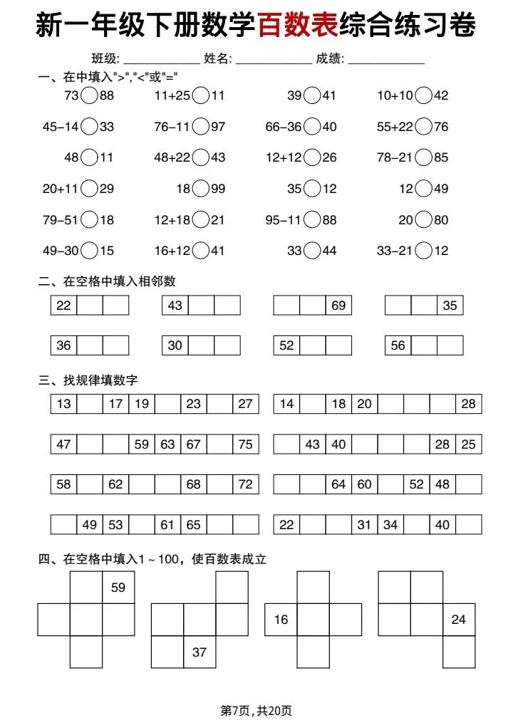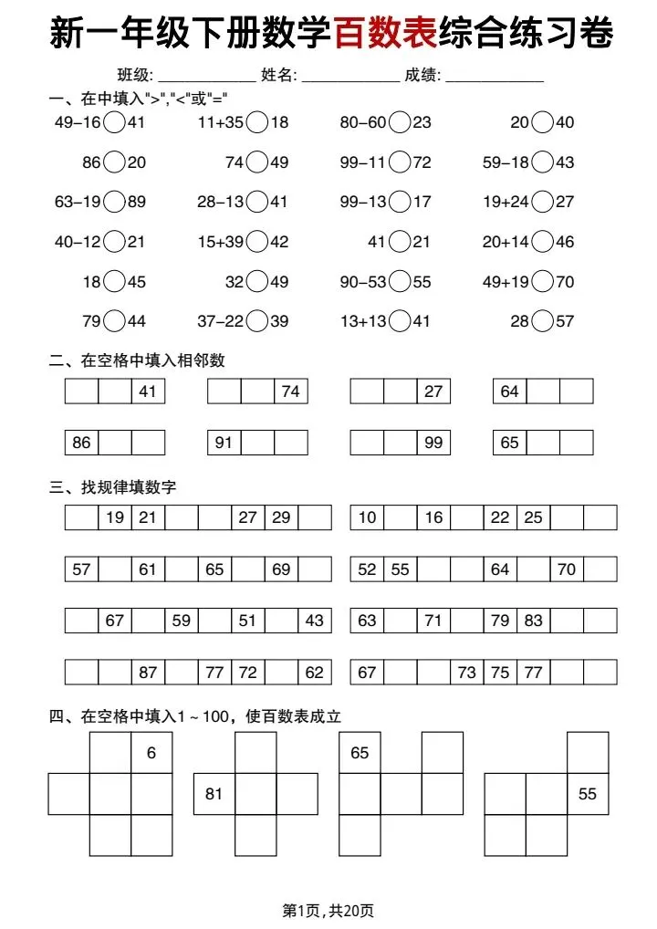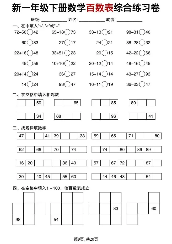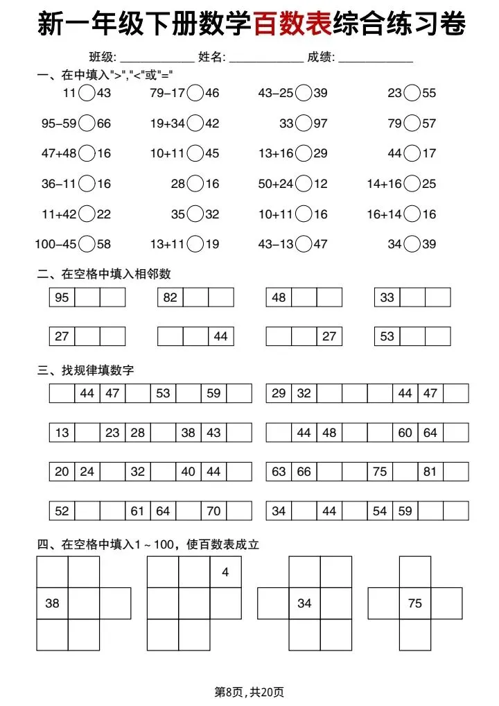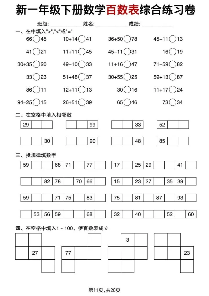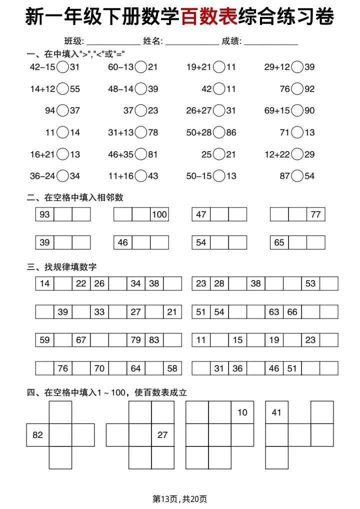 新一年级下册数学百数表综合练习卷(完整电子版可打印)