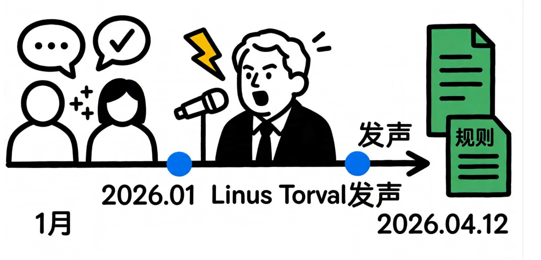 2026年4月12日,Linux内核维护团队正式发布AI生成代码使用准则。这份准则的核心只有一句话:谁点提交,谁负责。