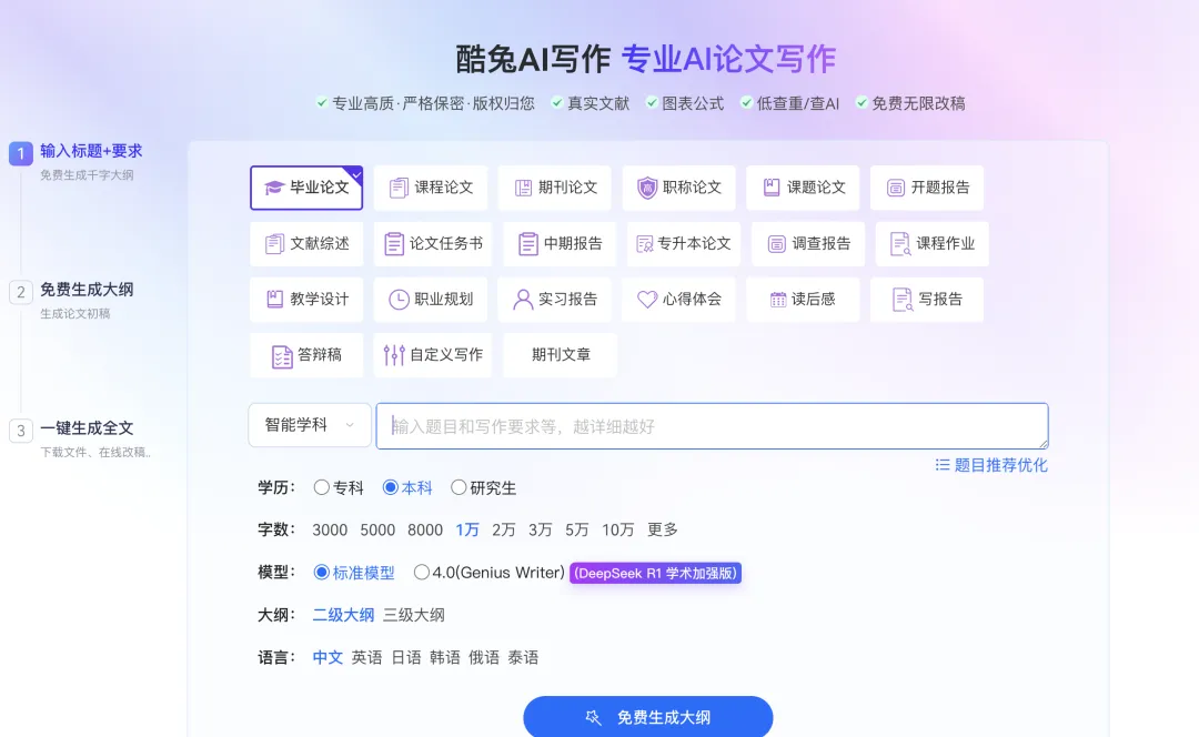 酷兔AI支持多语言专业写作,全面涵盖中文、英语、日语、韩语、俄语、泰语等主流语种,可根据需求切换语种完成AI写论文、AI论文写作与论文AI生成,精准适配不同语种的论文AI生成、AI生成论文需求。不管是AI写外语课程论文、AI写海外期刊投稿、AI写国际课题报告,还是AI写外文毕业论文、AI写外文实习报告,都能输出规范、流畅的多语种文稿,打破语言壁垒,拓宽论文写作适用场景。